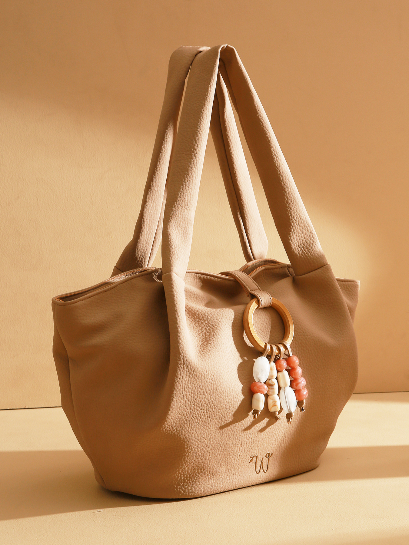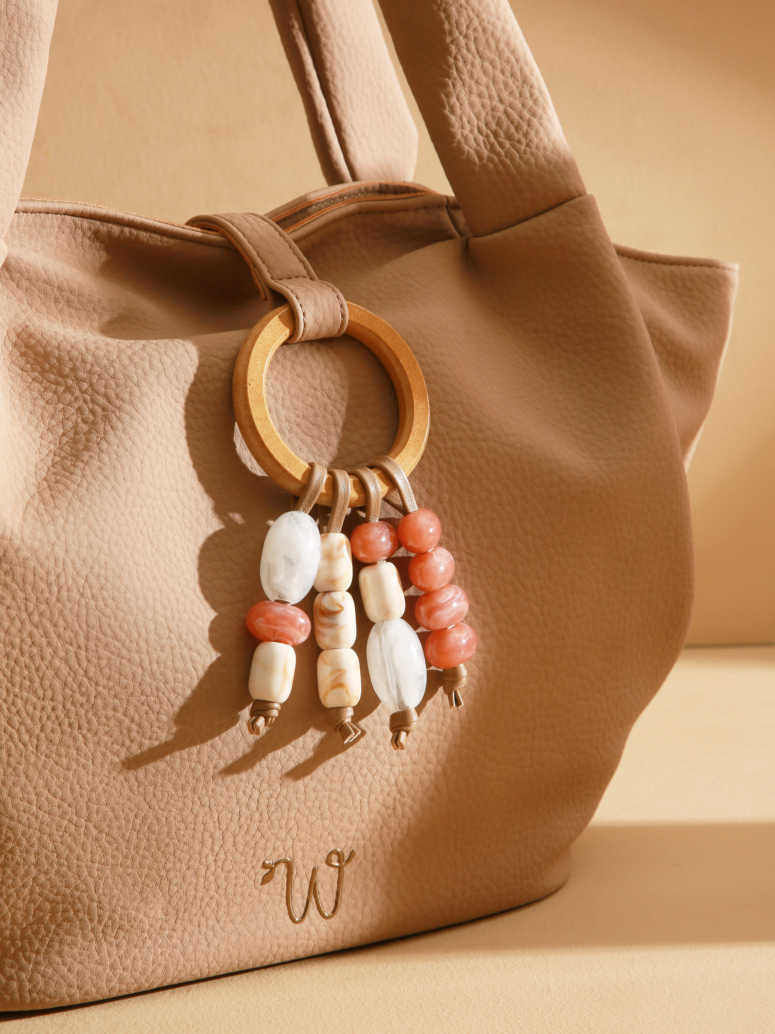 The Camomille Pearl shoulder bag stands out with its delicate beaded fringes cascading on the front and its wooden ring, signature details that add originality and refined countryside charm. Made from polyurethane containing 58% recycled materials, it combines lightness and durability. This zippered bag also features a zippered back pocket for convenient access and is lined with cotton and linen. Its wide, padded handles ensure comfortable wear, while the golden resin logo adds an elegant, modern touch.
