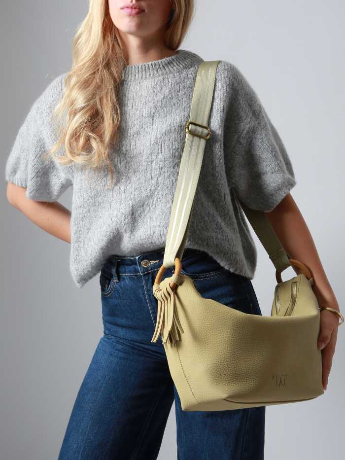 The CAMOMILLE crossbody bag stands out with elegant fringes on the sides near the rings and its adjustable strap adorned with an iridescent trim. Made of polyurethane composed of 58% recycled materials with a cotton and linen lining, it features a double opening, two separate compartments, a slip pocket, and a zip pocket for optimized storage. A bold and responsible accessory to wear on the shoulder or as a crossbody.