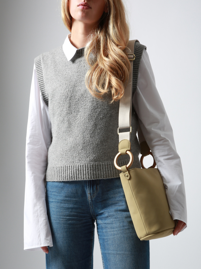 The CROCUS crossbody bag takes the shape of a zipped bucket bag, combining modernity and practicality. Made of polyurethane composed of 58% recycled materials with a cotton and linen lining, it blends style with responsible design. It features a main compartment, a slip pocket, and a zip pocket for optimal organization. The adjustable strap ensures comfortable wear, while the decorative rings on each side add a unique touch.