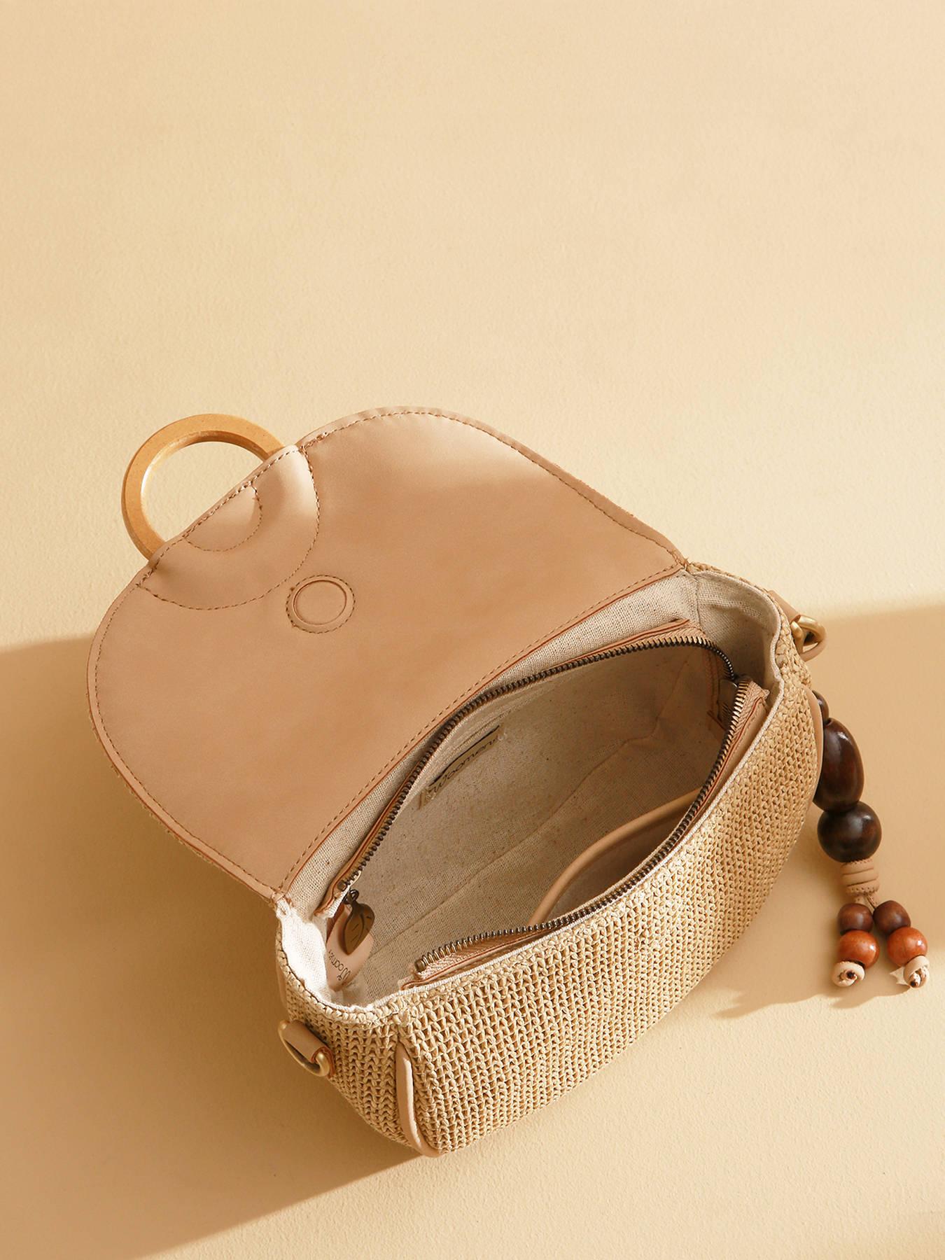 The Crocus Estival crossbody bag stands out with its raffia-effect material combined with polyurethane, offering a look that is both summery and elegant. Made from polyethylene with polyurethane trim and a cotton and linen lining, it combines lightness and durability. Featuring a flap with a magnetic snap complemented by a zip closure, as well as a polyurethane strap, this two-tone bag is practical and versatile. Inside, a zip pocket and a slip pocket make organizing your essentials easy. A beaded bag charm, sold with the model, adds a refined, summery touch to the overall design.