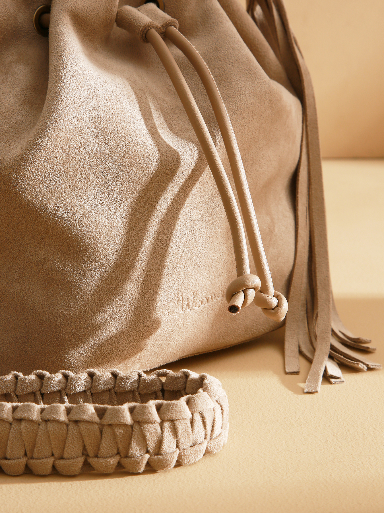 The Maranta drawstring crossbody bag captivates with its velvet material and braided strap, whose ends feature tassels that gracefully drape along the sides, adding lightness and fluidity to the design. Made from polyester, it combines elegance and practicality for everyday use. It closes with a hidden magnet and drawstring, and includes a small zippered slip pocket inside, attached to keep your essentials within easy reach. The fixed 125 cm strap ensures comfortable shoulder wear. The subtly embossed logo on the front adds a refined finishing touch.