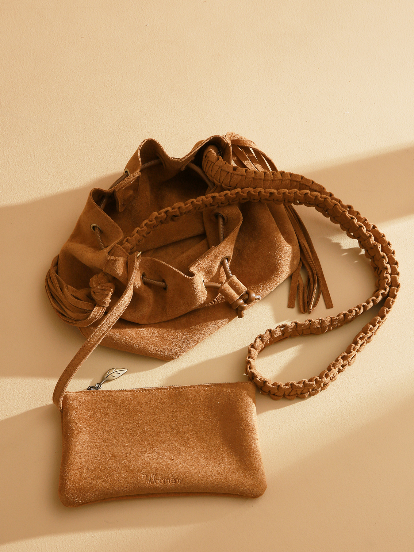 The Maranta drawstring crossbody bag captivates with its velvet material and braided strap, whose ends feature tassels that gracefully drape along the sides, adding lightness and fluidity to the design. Made from polyester, it combines elegance and practicality for everyday use. It closes with a hidden magnet and drawstring, and includes a small zippered slip pocket inside, attached to keep your essentials within easy reach. The fixed 125 cm strap ensures comfortable shoulder wear. The subtly embossed logo on the front adds a refined finishing touch.