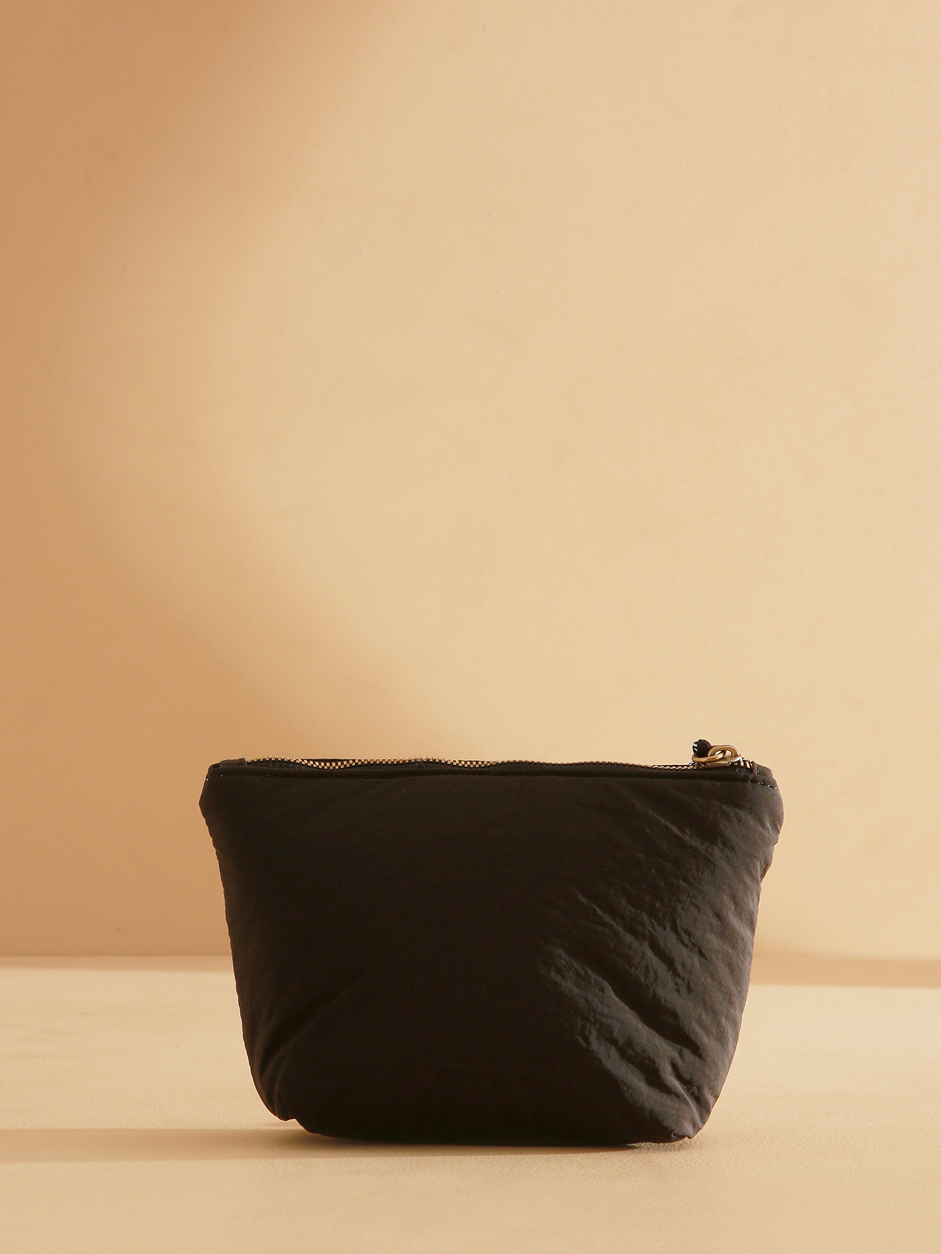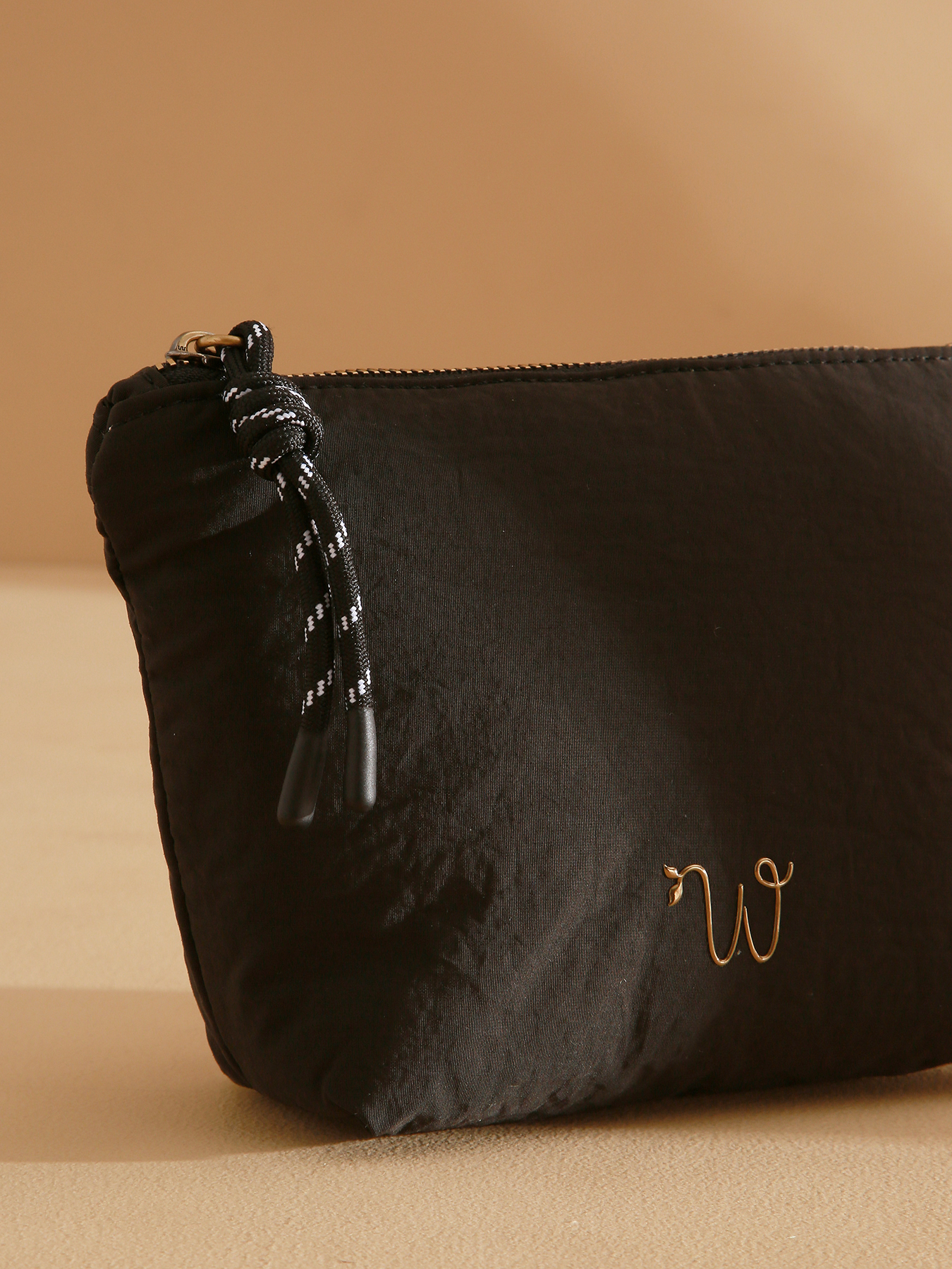 The small PRIMEVERE pouch, made from recycled nylon, stands out with its golden resin W logo and decorative cord. Featuring a secure zip closure, it offers a cotton and linen-lined interior with a pocket, combining practicality and elegance in a compact format—perfect for storing essentials with style and environmental respect.