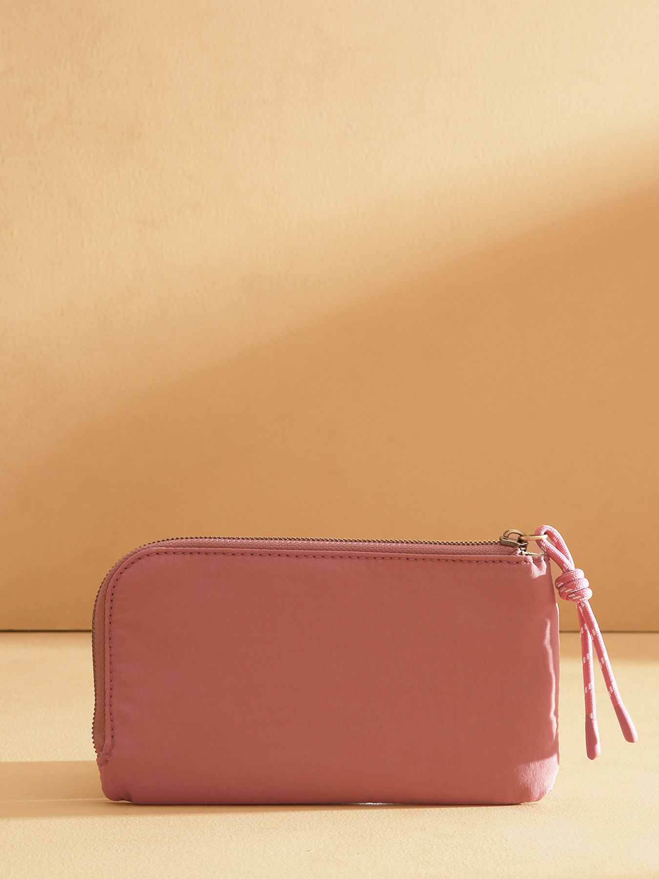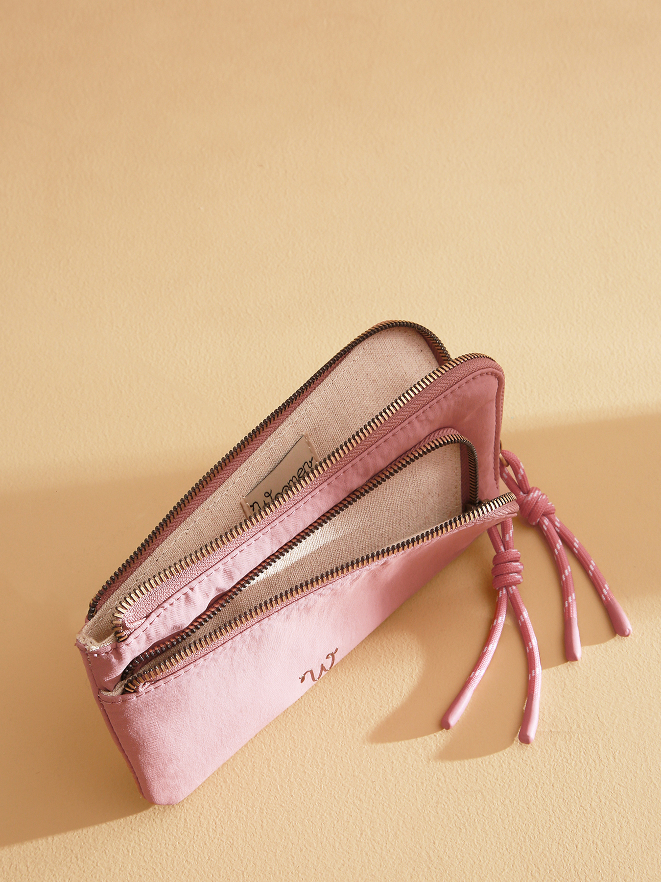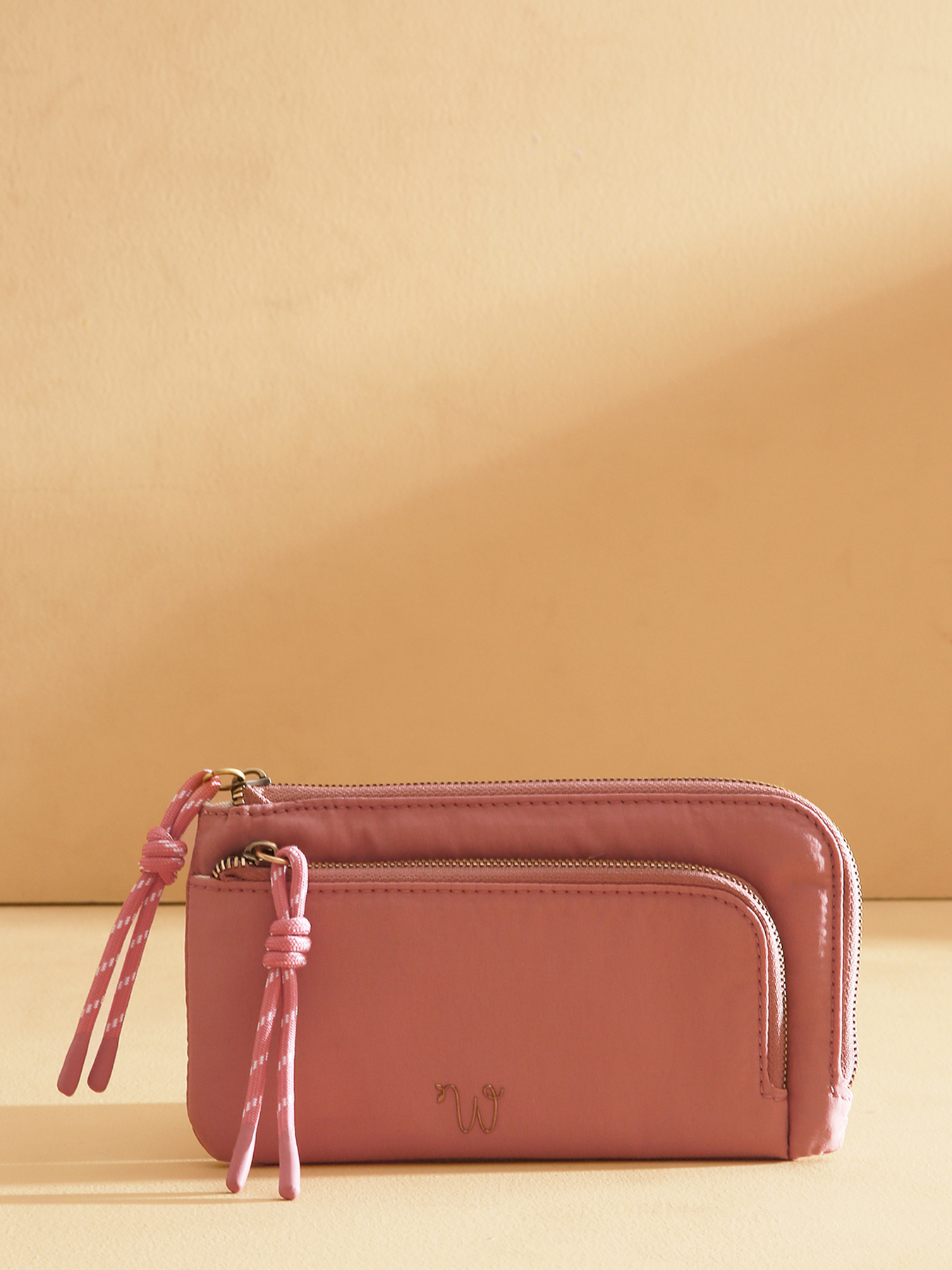 The Primevère wallet is crafted from recycled nylon with a cotton and linen lining, combining lightness and durability. It features two zip compartments to organize your essentials, while the gold-tone resin logo adds a refined finishing touch.
