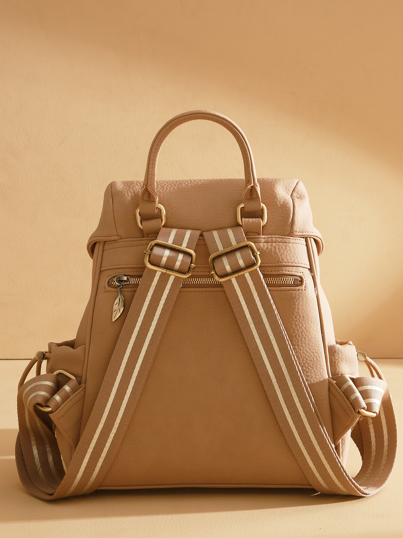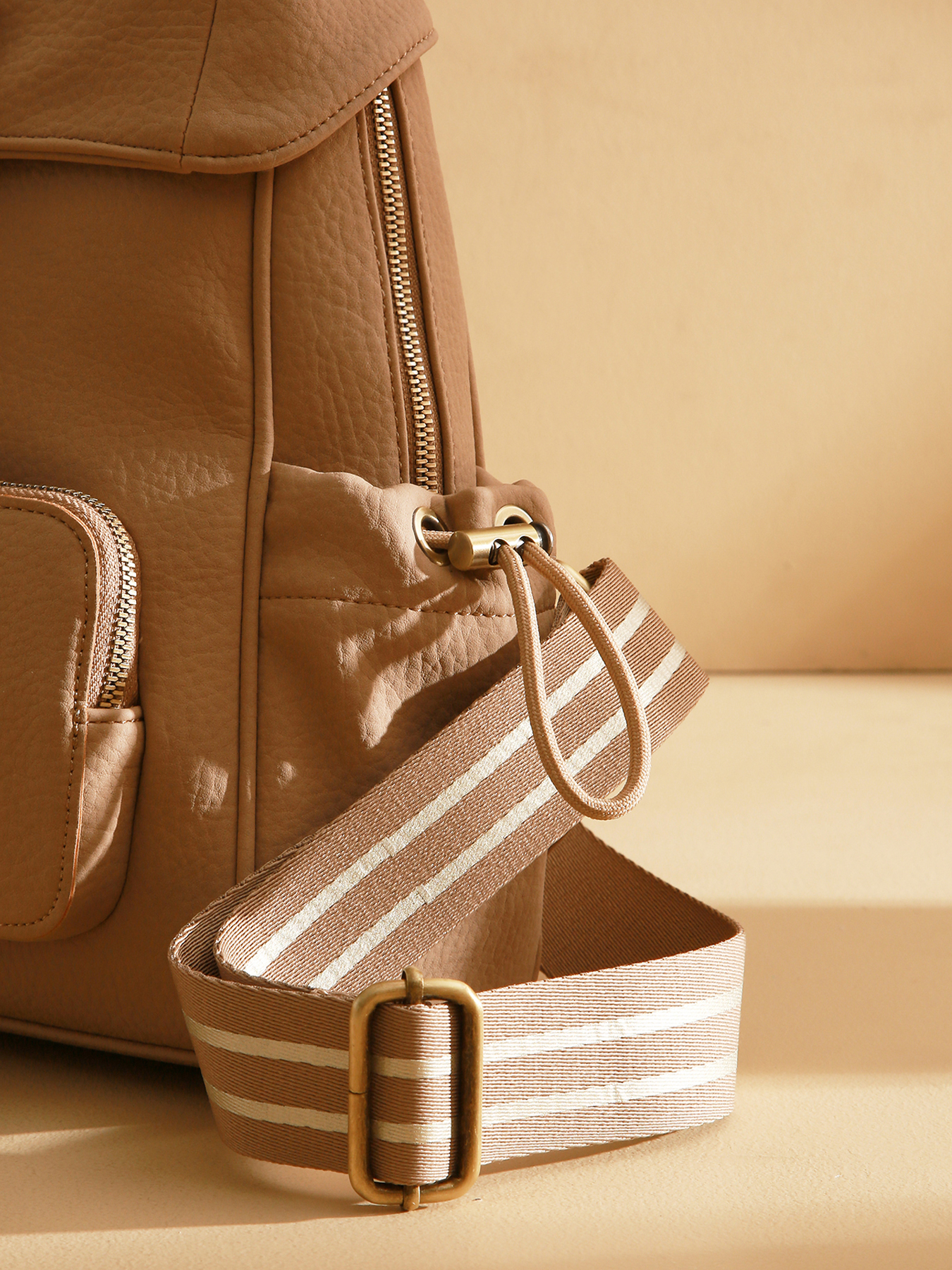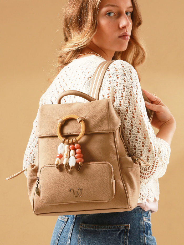 Le sac à dos de la ligne Camomille Pearl se distingue par ses franges perlées délicates et son anneau en bois, véritables signatures du modèle qui apportent élégance et originalité. Confectionné en polyuréthane dont 58% de matières recyclées avec doublure en coton et lin, il allie légèreté et résistance. Il dispose d’un compartiment principal zippé, d’une poche avant, de deux poches latérales et d’une poche au dos pour une organisation optimale. Le rabat aimanté assure sécurité et praticité, tandis que les bretelles réglables en coton irisé permettent un porté confortable et modulable. Son logo en résine dorée signe le modèle d’une note chic et contemporaine.