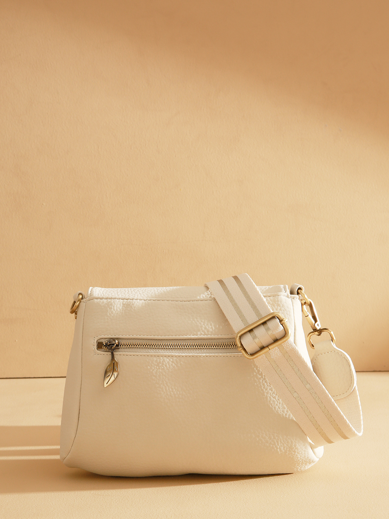 Le sac bandoulière de la ligne Camomille Pearl se distingue par son anneau en bois orné de perles sur le rabat et ses franges délicates, véritables signatures du modèle qui apportent élégance et originalité. Confectionné en polyuréthane dont 58% de matières recyclées avec doublure en coton et lin, il allie légèreté et résistance. Son rabat avec pression aimantée et zip, sa poche avant et la poche zippé au dos assurent sécurité et organisation. La bandoulière avec liserés dorés permet un porté modulable, tandis que le logo en résine doré apporte une touche moderne et raffinée.
