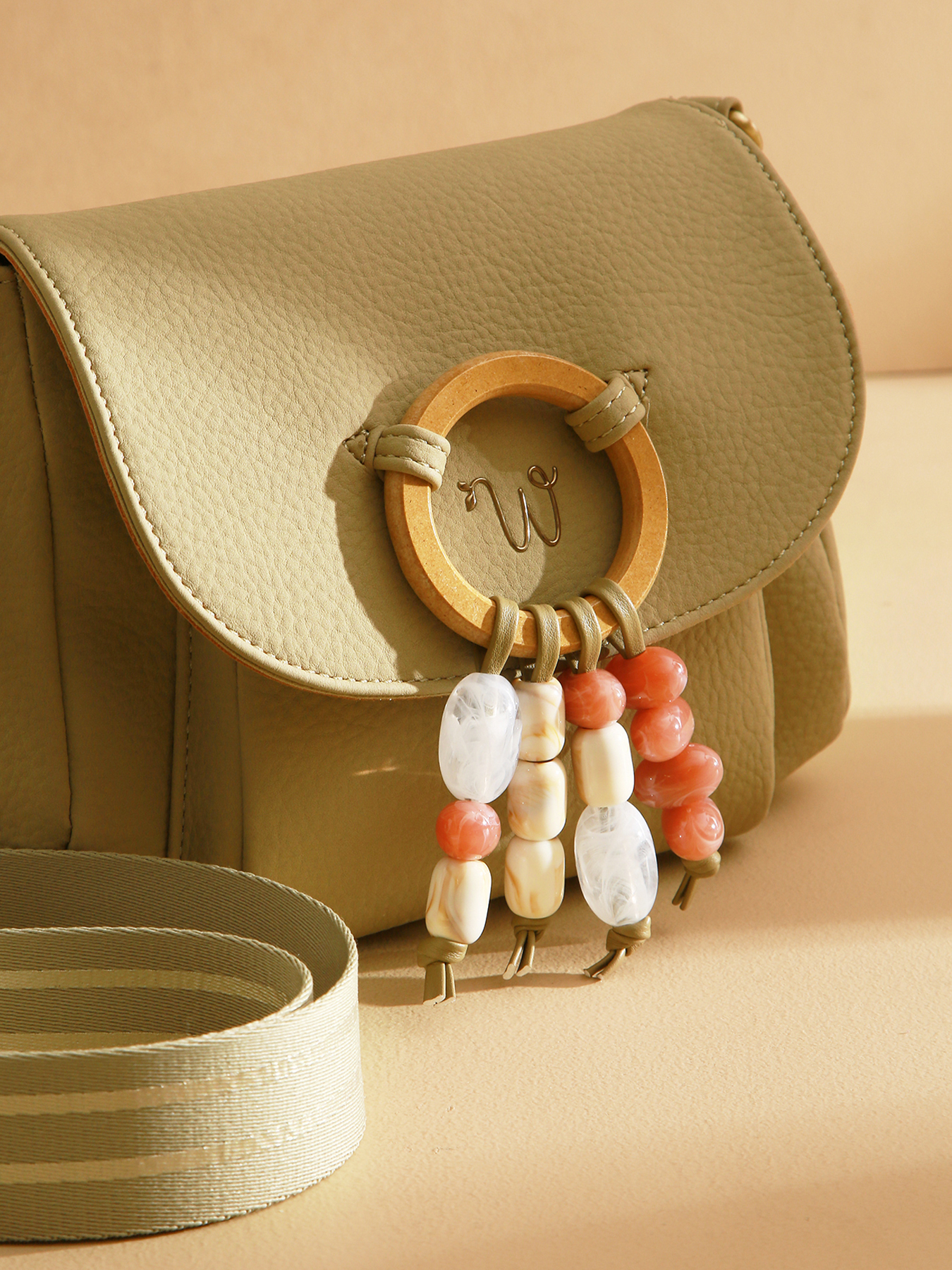 Le sac bandoulière de la ligne Camomille Pearl se distingue par son anneau en bois orné de perles sur le rabat et ses franges délicates, véritables signatures du modèle qui apportent élégance et originalité. Confectionné en polyuréthane dont 58% de matières recyclées avec doublure en coton et lin, il allie légèreté et résistance. Son rabat avec pression aimantée et zip, sa poche avant et la poche zippé au dos assurent sécurité et organisation. La bandoulière avec liserés dorés permet un porté modulable, tandis que le logo en résine doré apporte une touche moderne et raffinée.