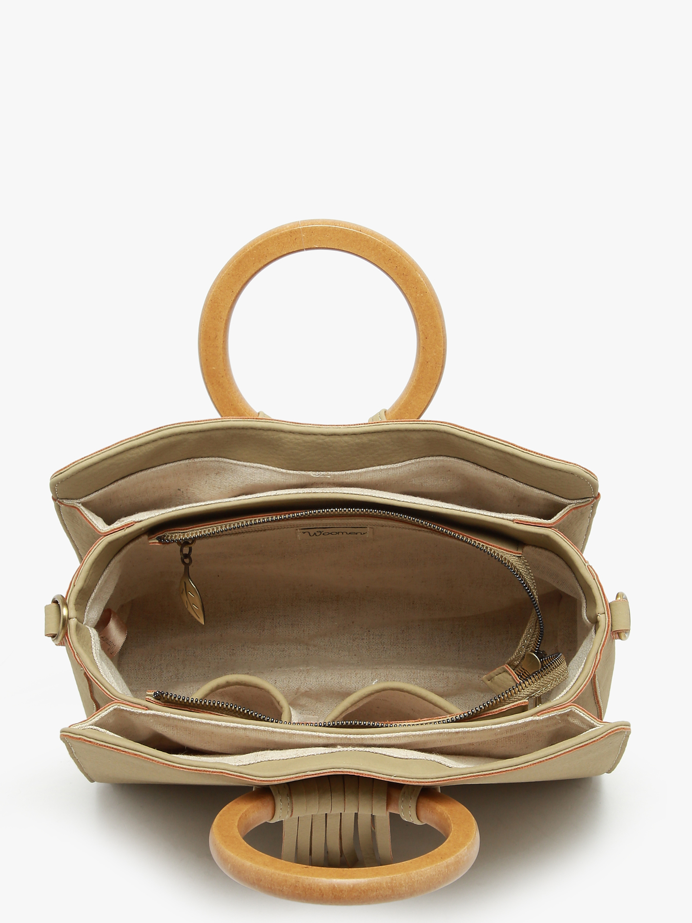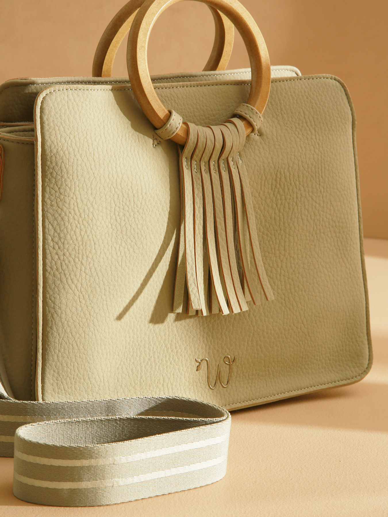 Le sac porté main CAMOMILLE séduit par son design en polyuréthane composé à 58% de matières recyclées et sa doublure en coton et lin. Fonctionnel et élégant, il dispose d’un compartiment principal zippé, de plusieurs poches, d’une bandoulière irisée réglable et amovible, de franges, d’anneaux en bois et d’un logo incrusté. Le sac affiche également un nouveau logo distinctif, apportant une touche moderne et raffinée.