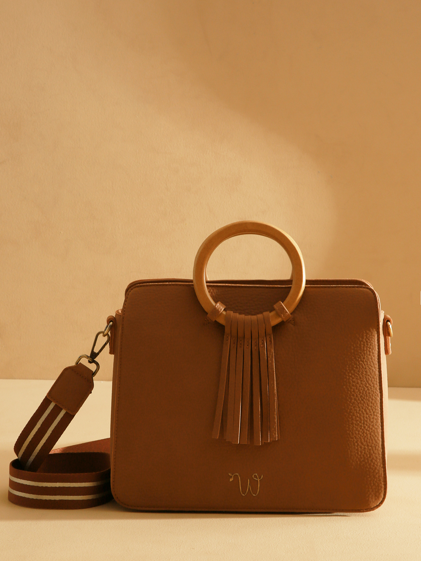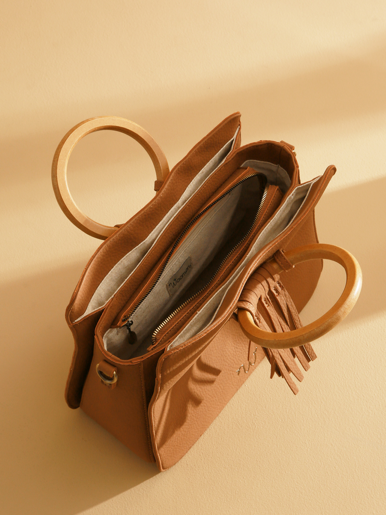 Le sac porté main CAMOMILLE séduit par son design en polyuréthane composé à 58% de matières recyclées et sa doublure en coton et lin. Fonctionnel et élégant, il dispose d’un compartiment principal zippé, de plusieurs poches, d’une bandoulière irisée réglable et amovible, de franges, d’anneaux en bois et d’un logo incrusté. Le sac affiche également un nouveau logo distinctif, apportant une touche moderne et raffinée.
