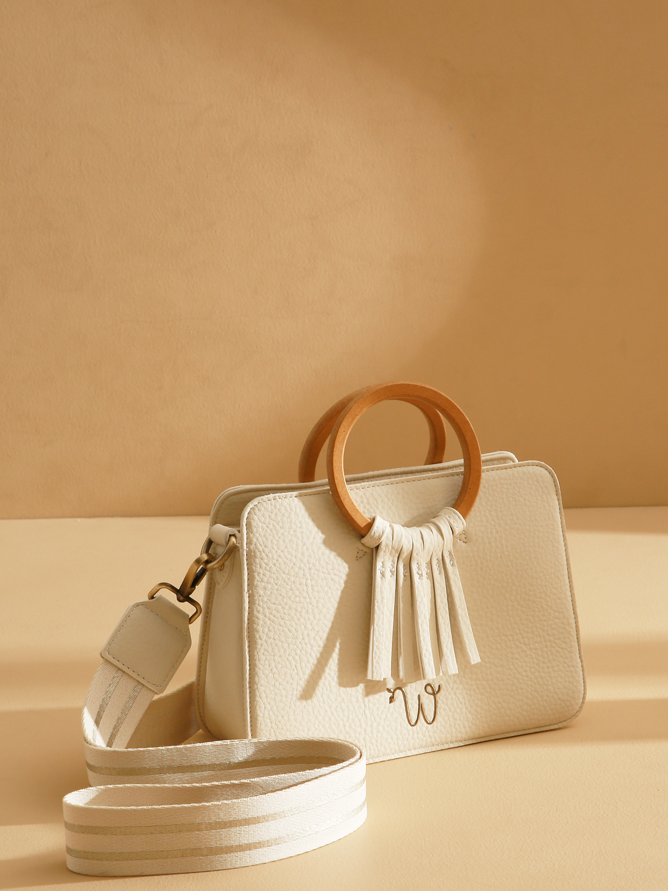 Le sac bandoulière CAMOMILLE allie élégance et praticité avec son design en polyuréthane composé à 58% de matières recyclées et sa doublure en coton et lin. Doté d’une bandoulière irisée réglable et amovible, il offre un compartiment principal zippé, une poche éclair intérieure, des poches avant et dos, un logo incrusté, ainsi que des finitions raffinées avec franges, anneaux en bois et fermetures aimantées. Le sac affiche également un nouveau logo distinctif, apportant une touche moderne et raffinée.