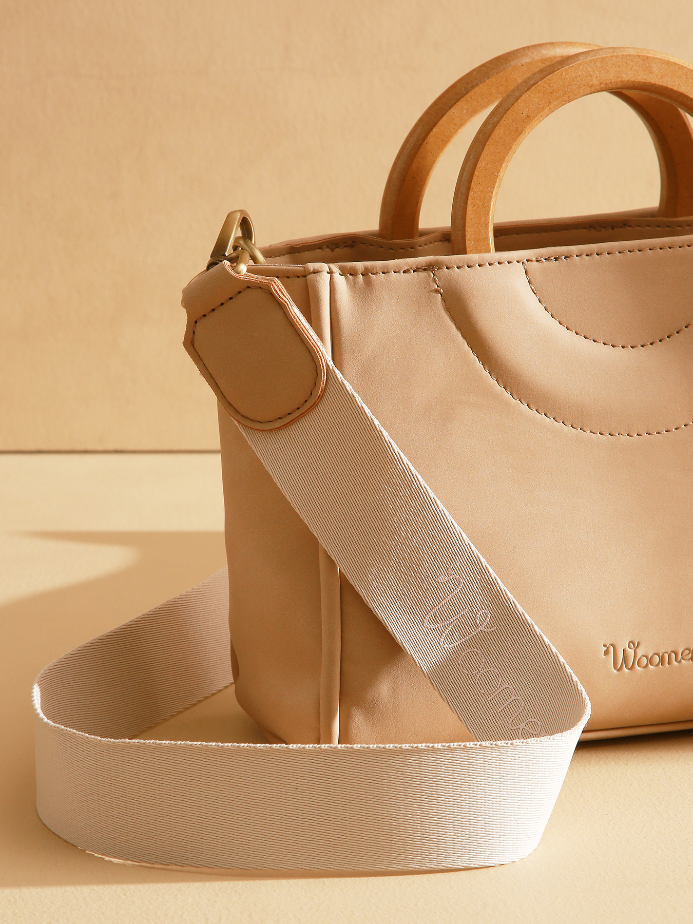 Le sac porté main CROCUS, en polyuréthane composé à 58% de matières recyclées avec une doublure coton et lin, se ferme par une fermeture zippée. Il se porte en bandoulière ou à la main et dispose d’un compartiment unique, d’une poche simple et d’une poche éclair. Sa bandoulière beige avec l’imprimé Woomen et l’anneau en bois en guise de poignée ajoutent une touche élégante.