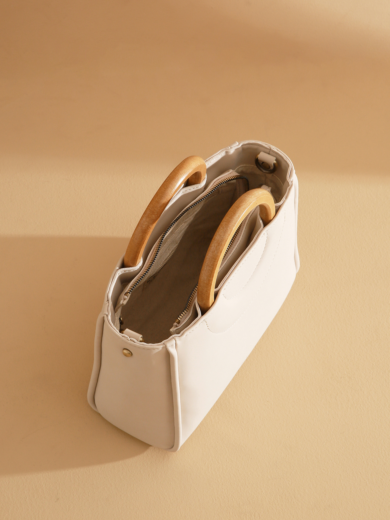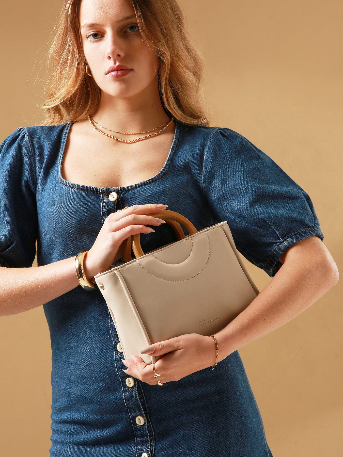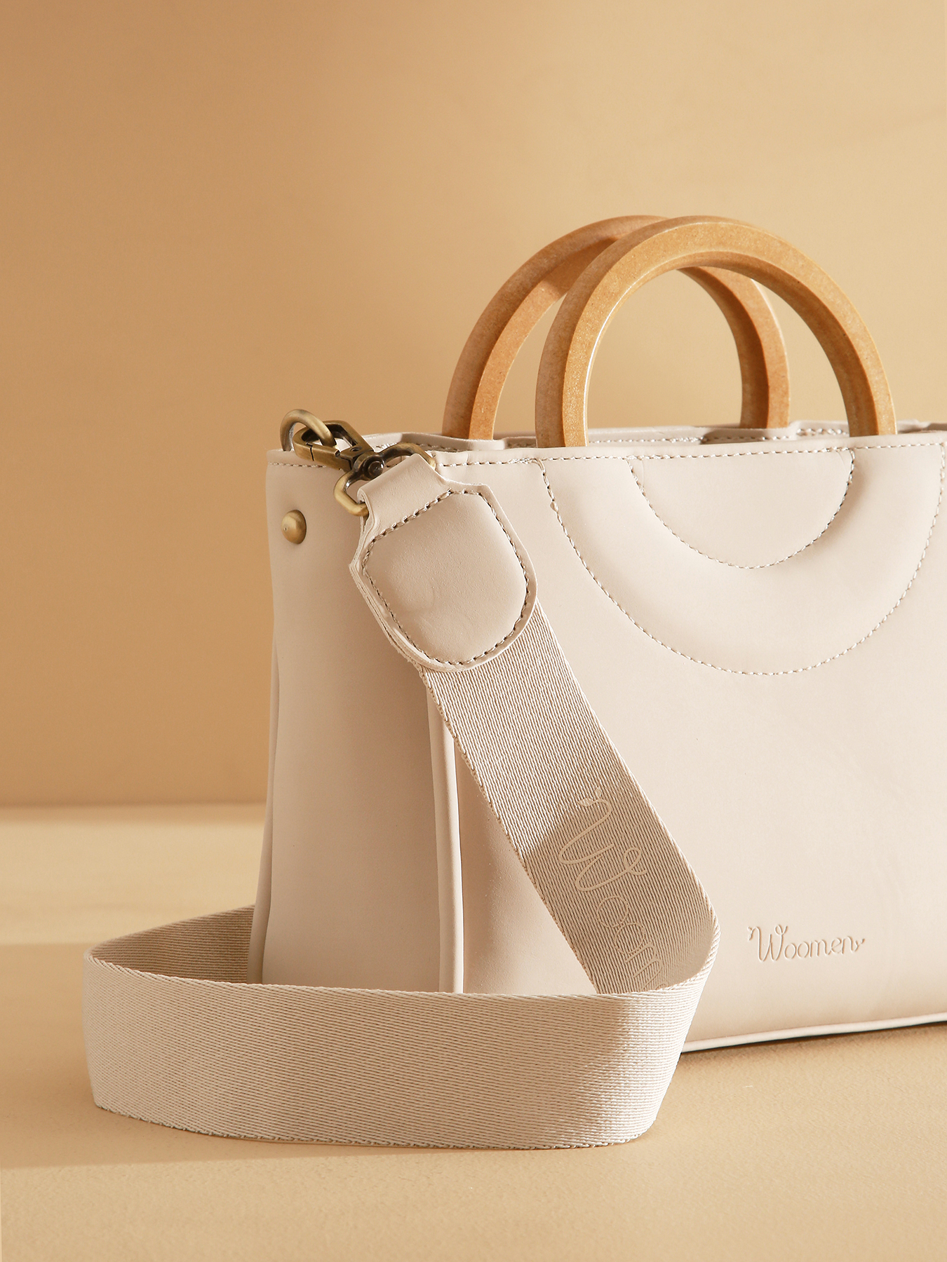 Le sac porté main CROCUS, en polyuréthane composé à 58% de matières recyclées avec une doublure coton et lin, se ferme par une fermeture zippée. Il se porte en bandoulière ou à la main et dispose d’un compartiment unique, d’une poche simple et d’une poche éclair. Sa bandoulière beige avec l’imprimé Woomen et l’anneau en bois en guise de poignée ajoutent une touche élégante.