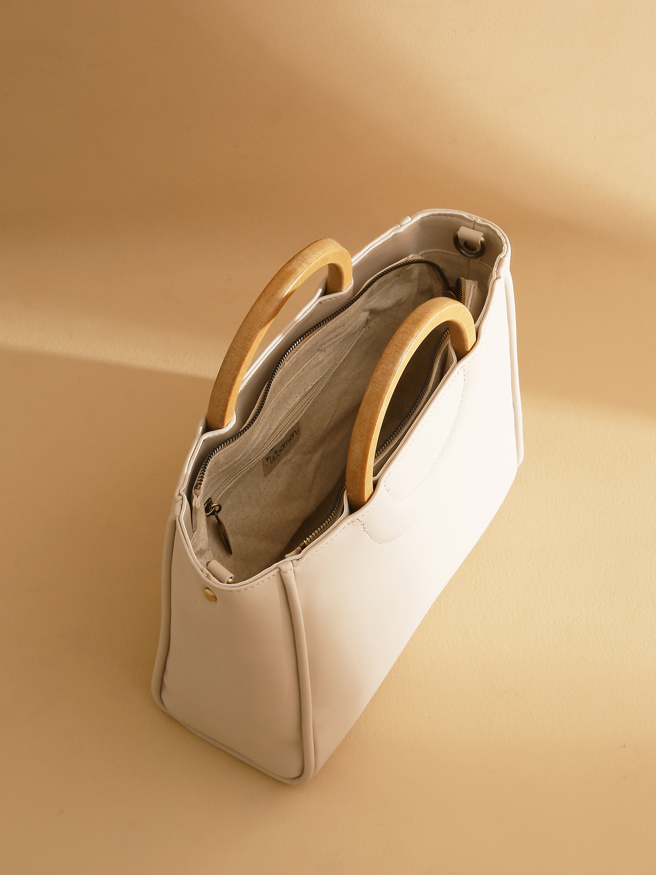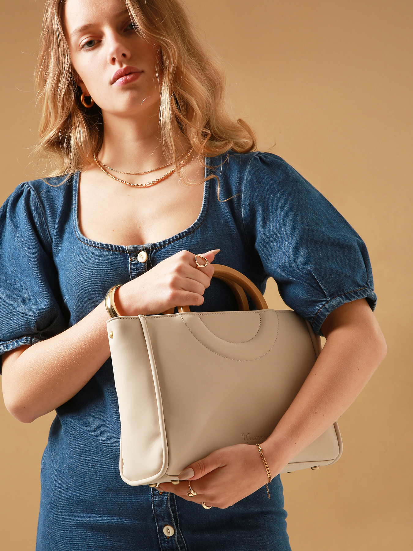 Le sac porté main CROCUS, en polyuréthane composé à 58% de matières recyclées avec doublure coton et lin, se ferme par une fermeture zippée. Il se porte en bandoulière ou à la main et dispose de deux poches simples, une poche zippée et un compartiment unique. Sa bandoulière beige avec l’imprimé Woomen et l’anneau en bois en guise de poignée apportent une touche chic.