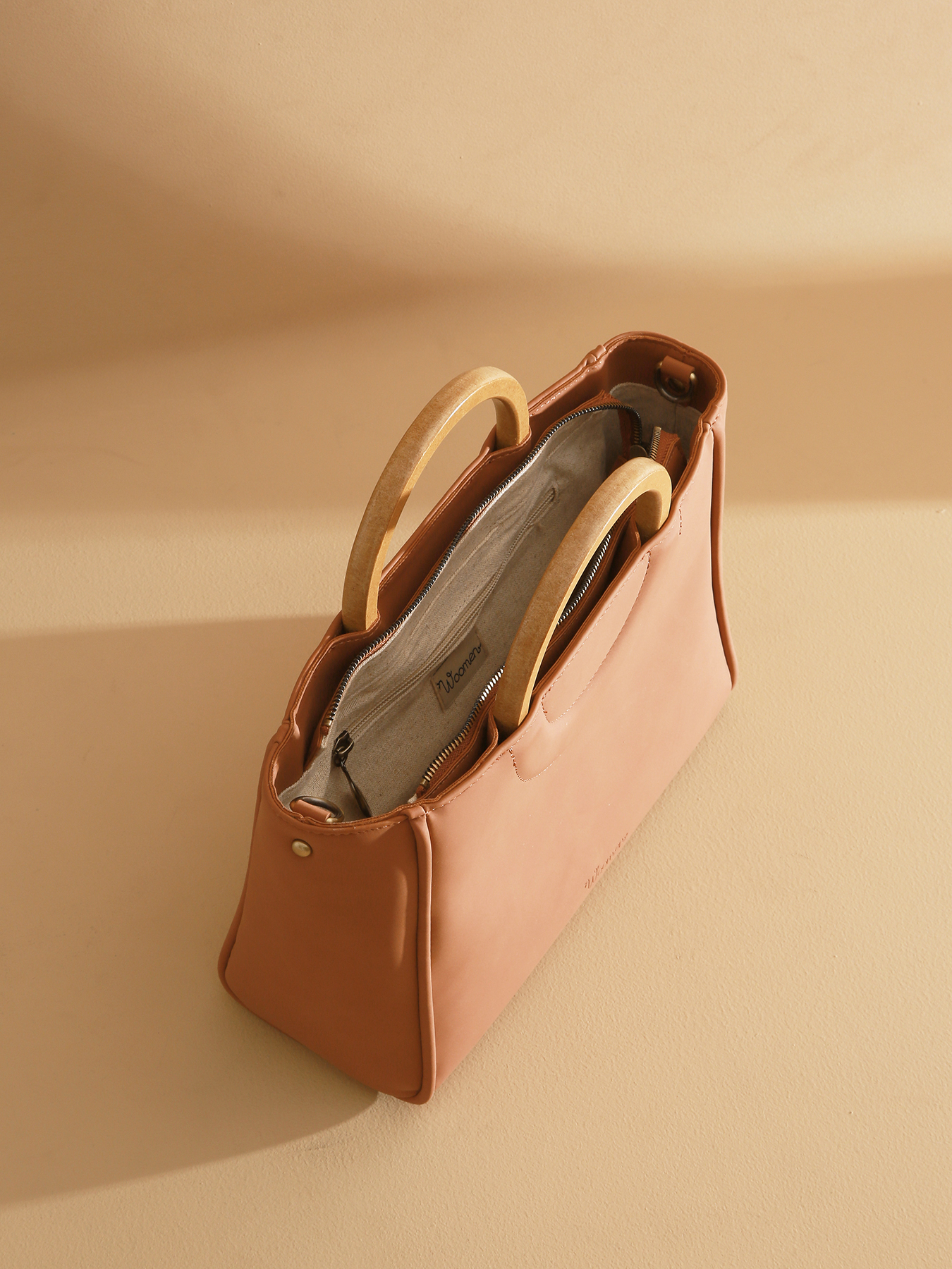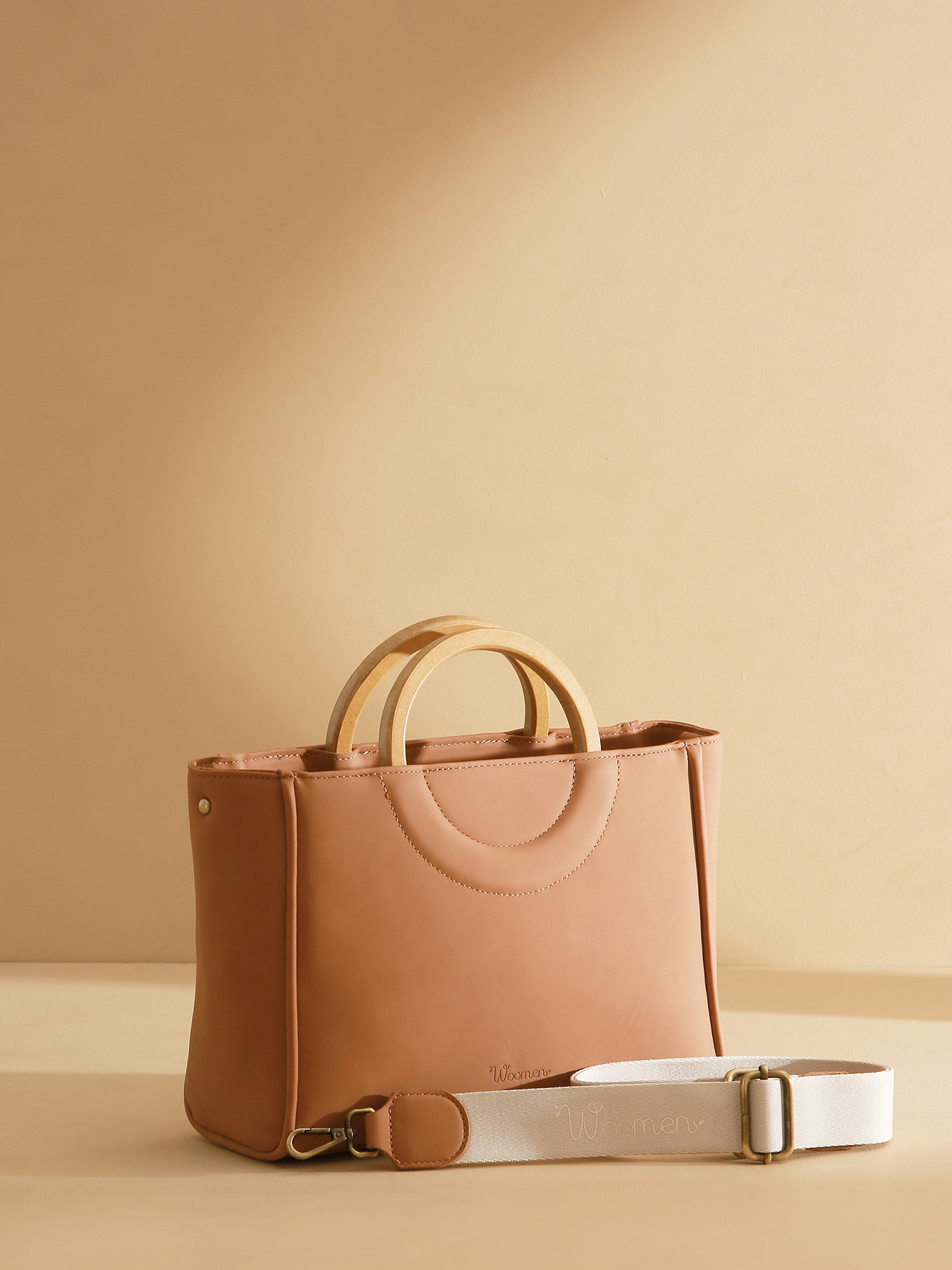 Le sac porté main CROCUS, en polyuréthane composé à 58% de matières recyclées avec doublure coton et lin, se ferme par une fermeture zippée. Il se porte en bandoulière ou à la main et dispose de deux poches simples, une poche zippée et un compartiment unique. Sa bandoulière beige avec l’imprimé Woomen et l’anneau en bois en guise de poignée apportent une touche chic.