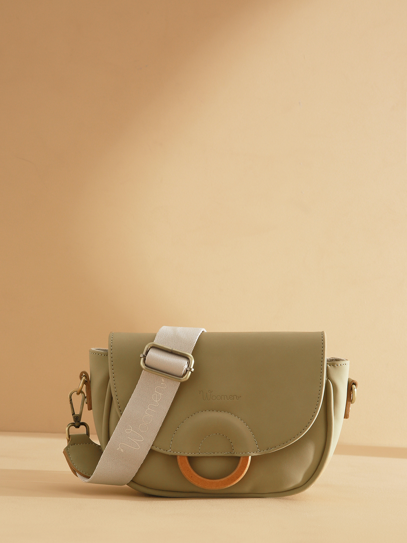 Le sac bandoulière CROCUS, en polyuréthane composé à 58% de matières recyclées avec doublure coton et lin, se ferme par une fermeture zippée, un rabat et un aimant. Il se porte en bandoulière porté haut, avec une poche au dos, une poche simple et une poche zippée à l’intérieur. Sa bandoulière beige avec l'imprimé Woomen et l'anneau en bois sur le rabat ajoutent une touche élégante.