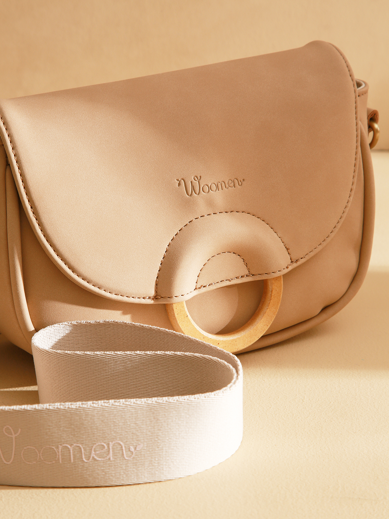 Le sac bandoulière CROCUS, en polyuréthane composé à 58% de matières recyclées avec doublure coton et lin, se ferme par une fermeture zippée, un rabat et un aimant. Il se porte en bandoulière porté haut, avec une poche au dos, une poche simple et une poche zippée à l’intérieur. Sa bandoulière beige avec l'imprimé Woomen et l'anneau en bois sur le rabat ajoutent une touche élégante.