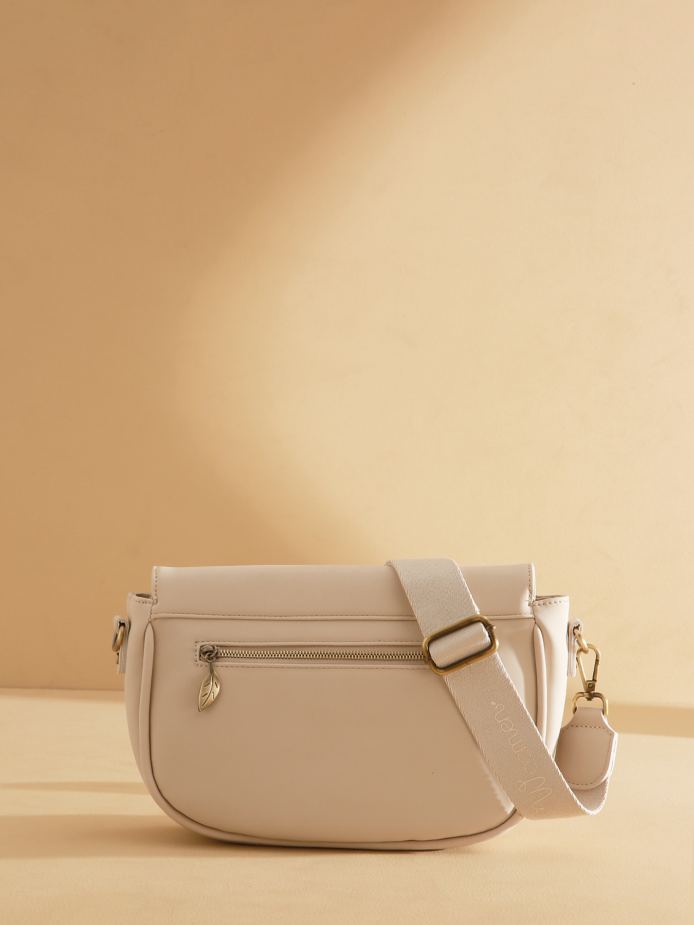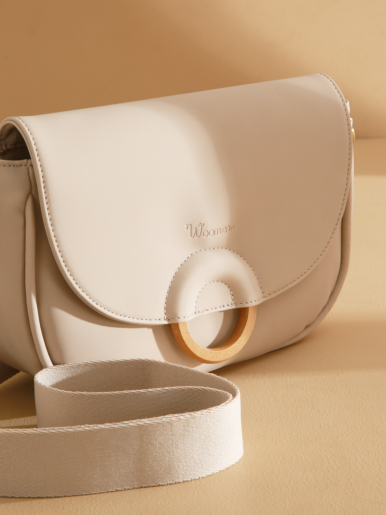 Le sac bandoulière CROCUS, en polyuréthane intégrant 58% de matières recyclées avec doublure coton et lin, se ferme par une fermeture zippée, un rabat et un aimant. Il se porte en bandoulière porté haut et dispose de deux poches simples, une poche zippée et une poche au dos. Sa bandoulière beige avec l'imprimé Woomen et l'anneau en bois sur le rabat ajoutent une touche élégante.