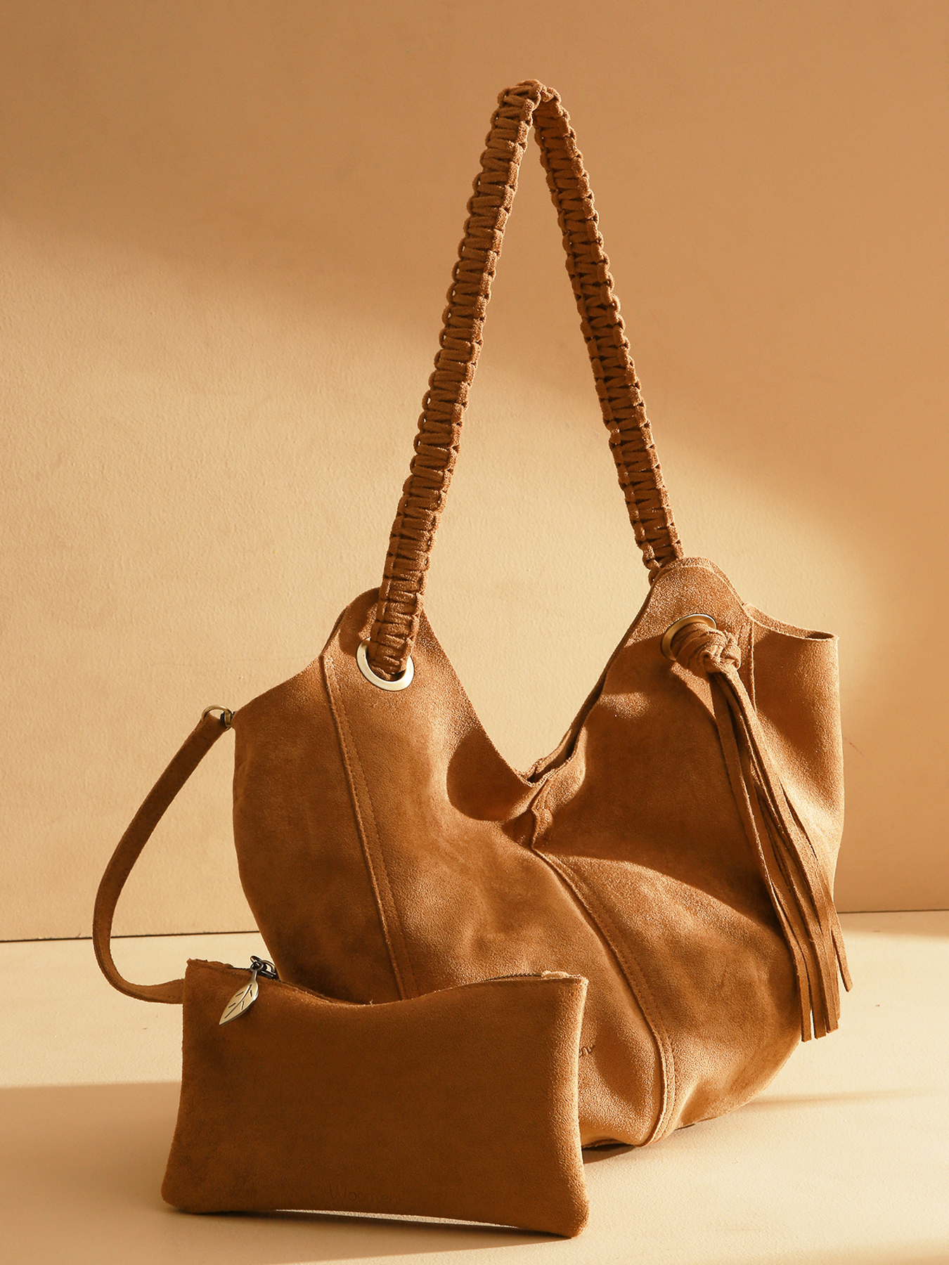 Le sac porté épaule format S de la ligne Maranta se distingue par sa matière en velours et sa bandoulière tressée, dont les extrémités se terminent par des pompons retombant... En savoir plus