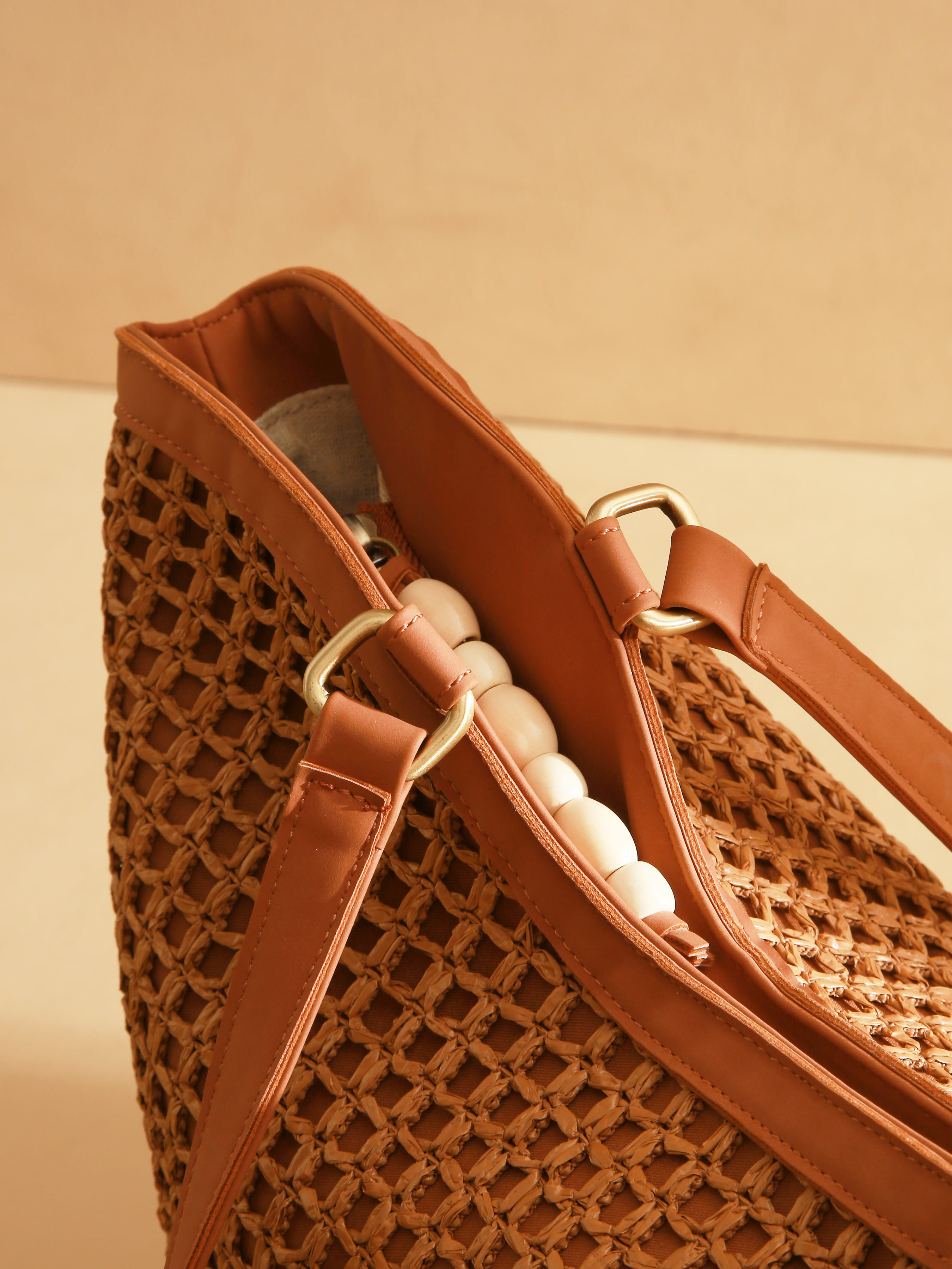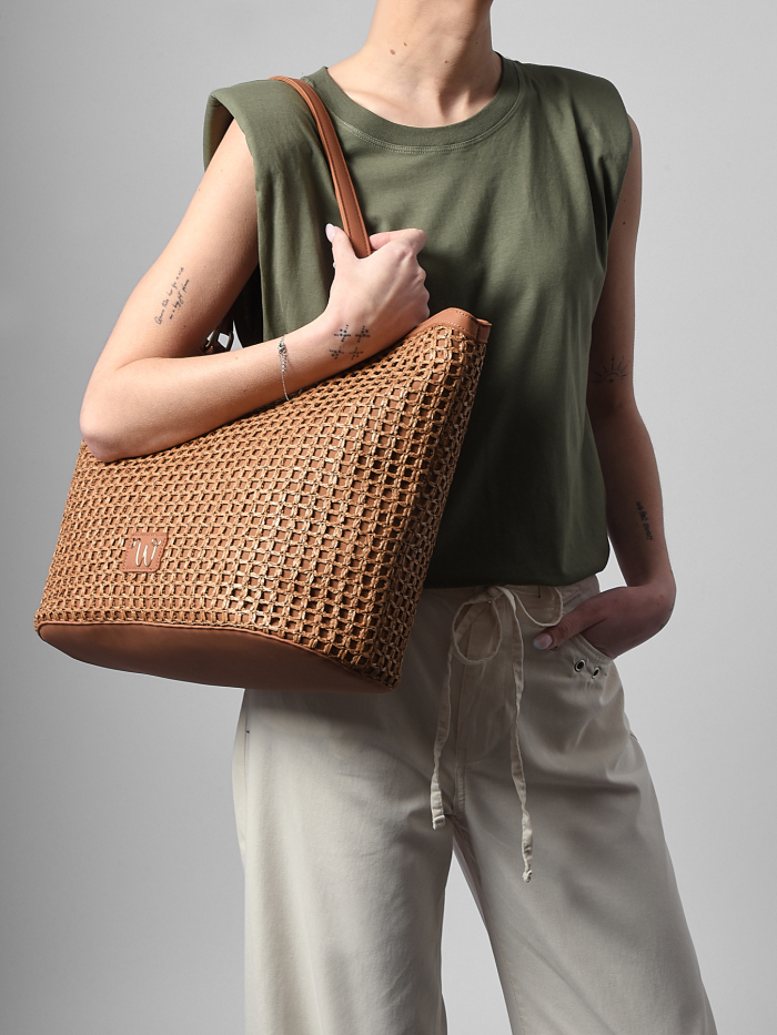 Le sac porté épaule de la ligne Neflier Estival se distingue par ses finitions précieuses et le détail de perles sur le zip, apportant élégance et esprit estival au design. Confectionné en polypropylène garni de polyuréthane recyclé et doublé en coton et lin, il allie légèreté et solidité. Ce sac bi-matière dispose d’une fermeture zippée et du logo en résine doré pour une touche raffinée.