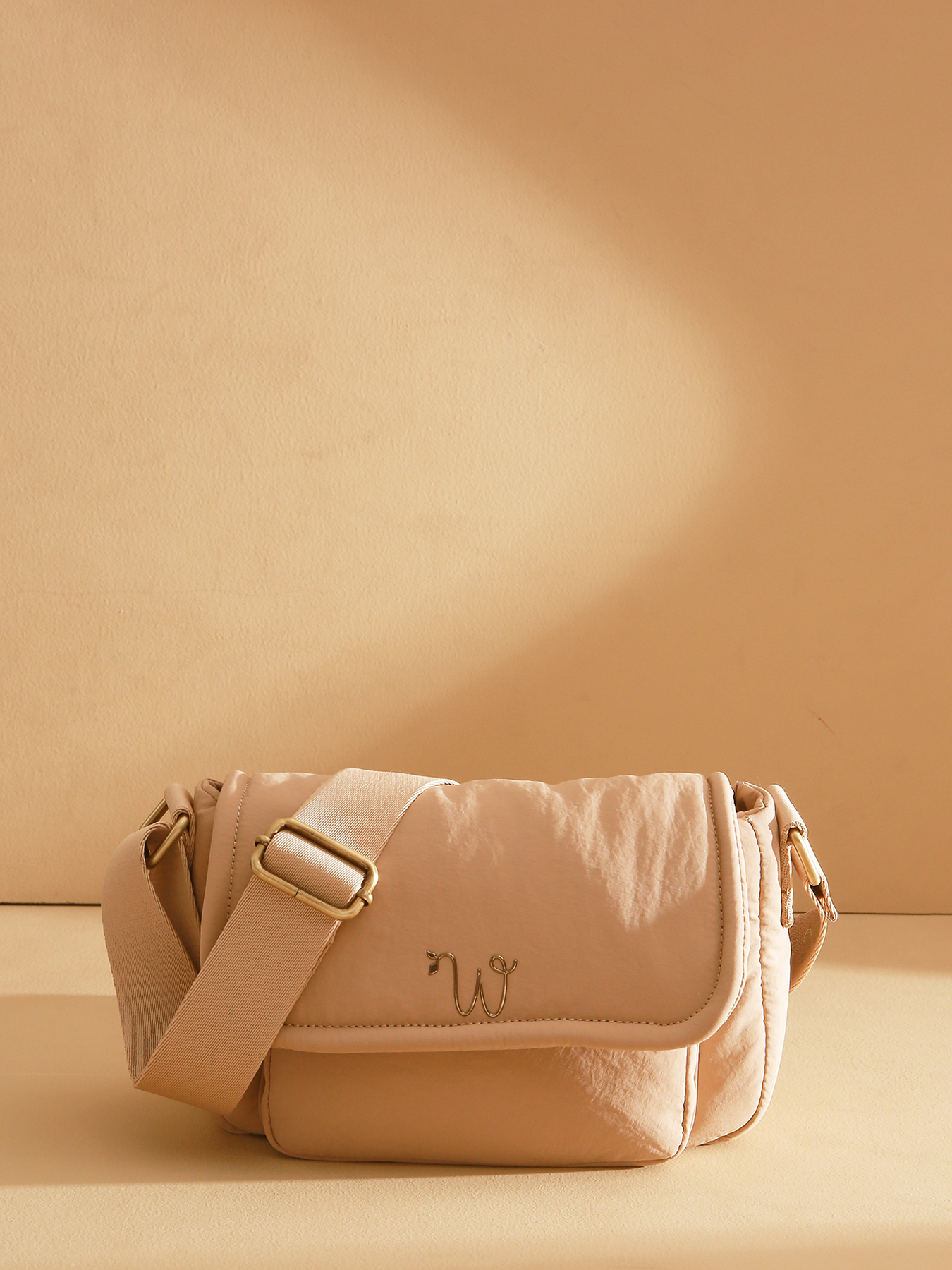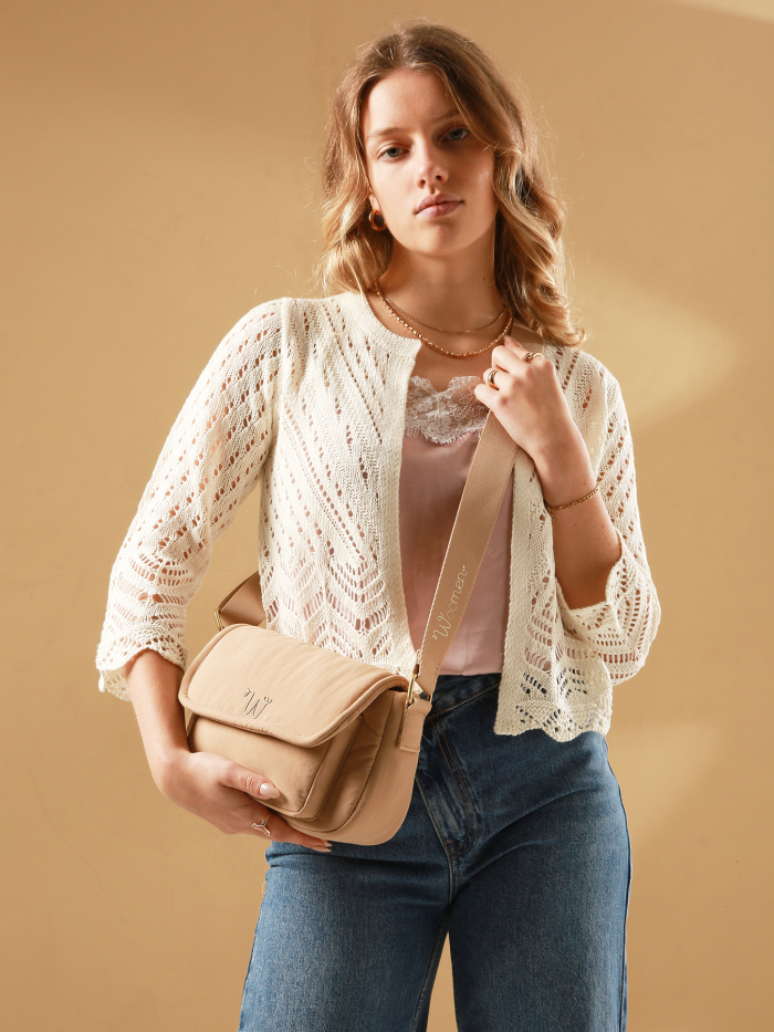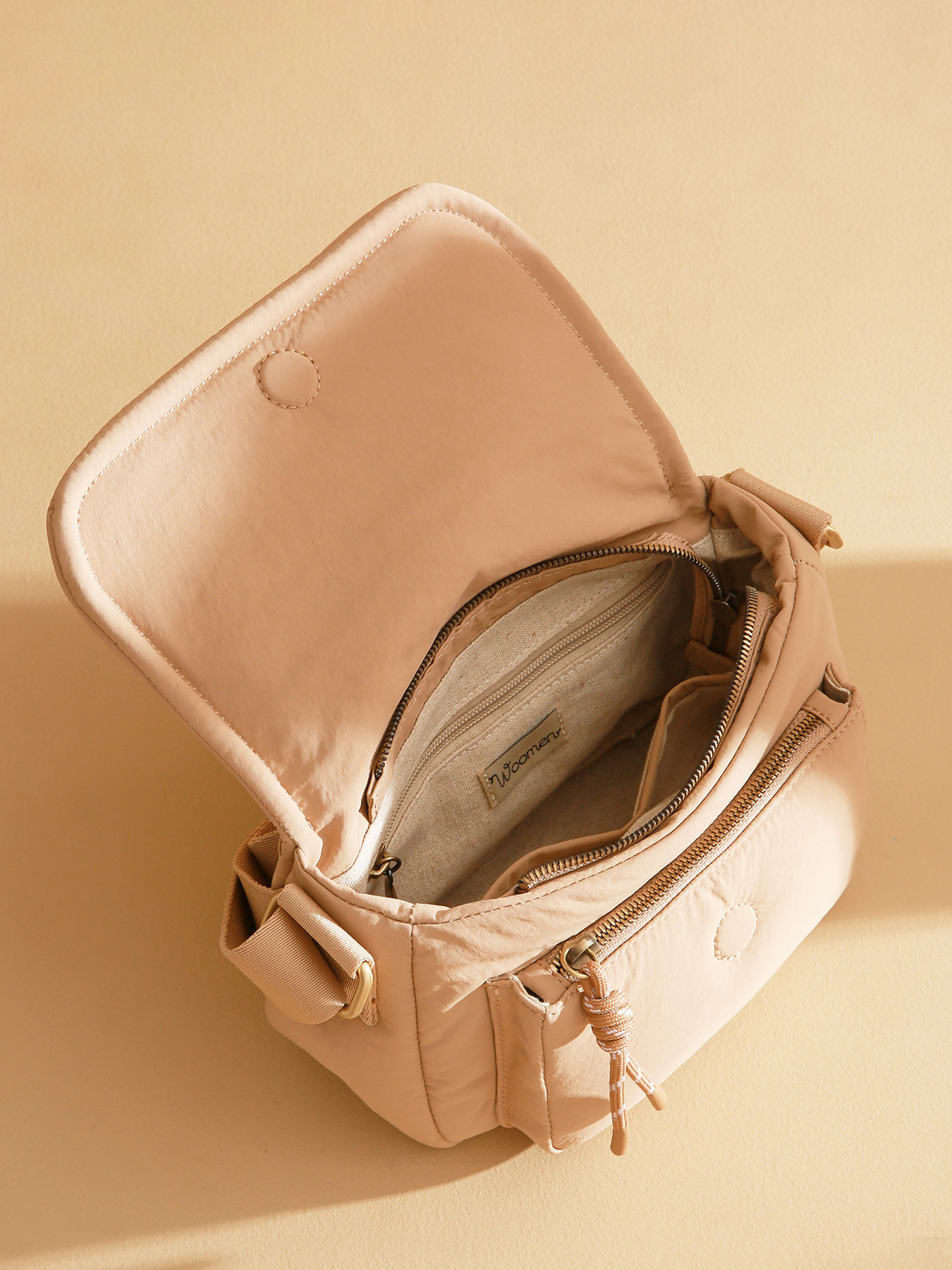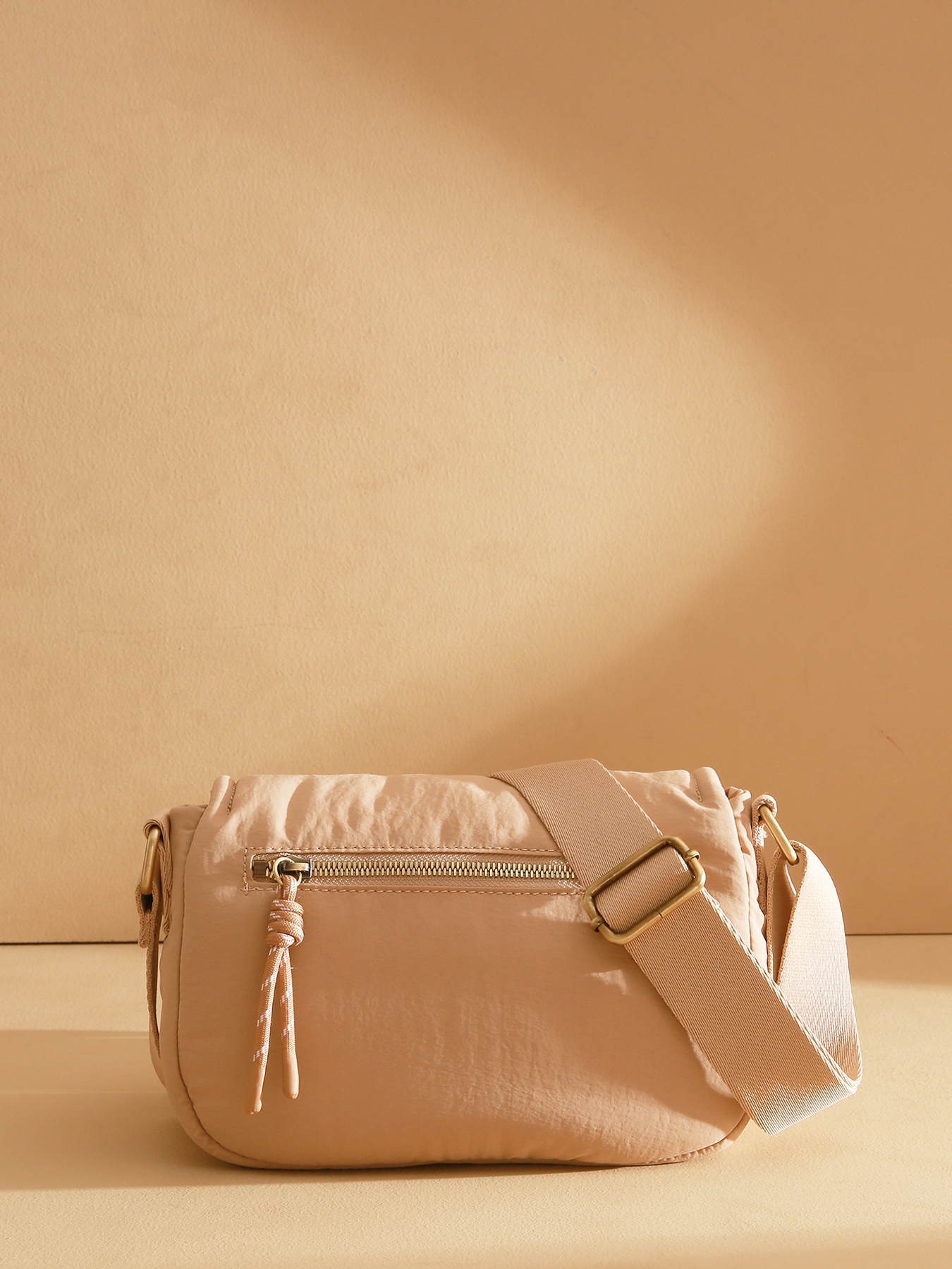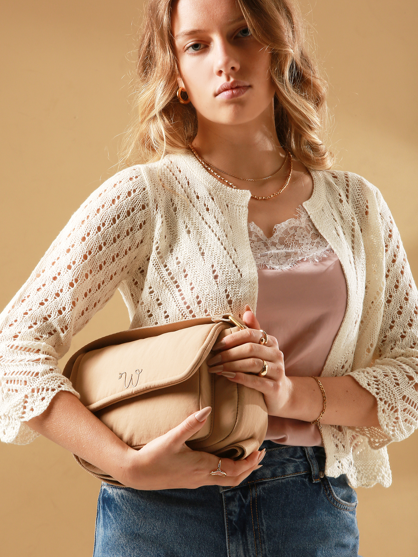 Le sac bandoulière PRIMEVERE, au petit format, séduit par son rabat aimanté, sa fermeture zippée sécurisée et ses poches. Il est zippé à l'avant et l'arrière. Confectionné en nylon recyclé, il dispose d’une bandoulière réglable pour un porté en bandoulière, d’un intérieur doublé en coton et lin comprenant deux poches simples, une poche zippée et un compartiment unique, le logo doré en résine et les cordons fantaisie apportent une touche raffinée.