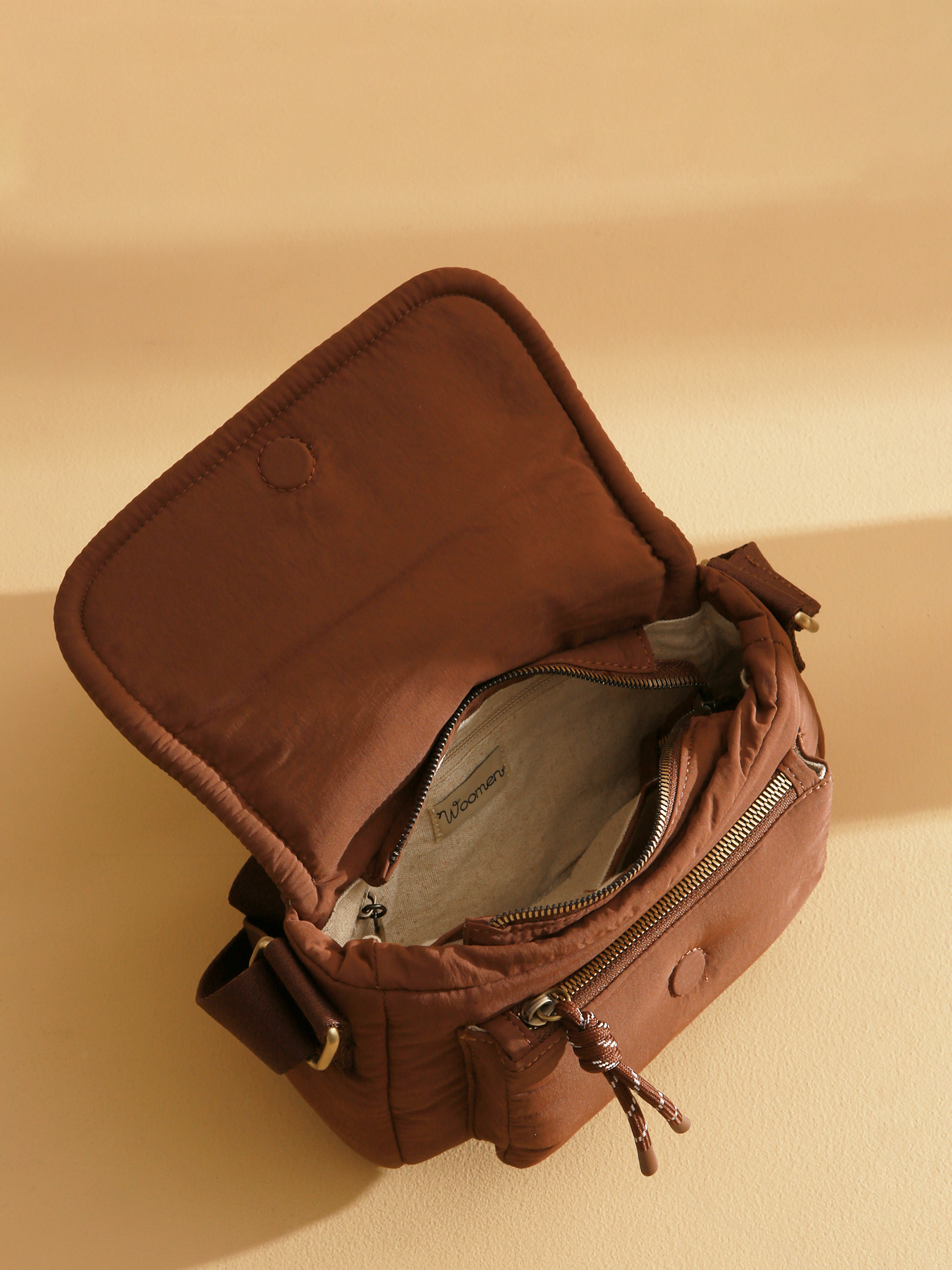 Le sac bandoulière PRIMEVERE, au petit format, séduit par son rabat aimanté, sa fermeture zippée sécurisée et ses poches. Il est zippé à l'avant et l'arrière. Confectionné en nylon recyclé, il dispose d’une bandoulière réglable pour un porté en bandoulière, d’un intérieur doublé en coton et lin comprenant deux poches simples, une poche zippée et un compartiment unique, le logo doré en résine et les cordons fantaisie apportent une touche raffinée.