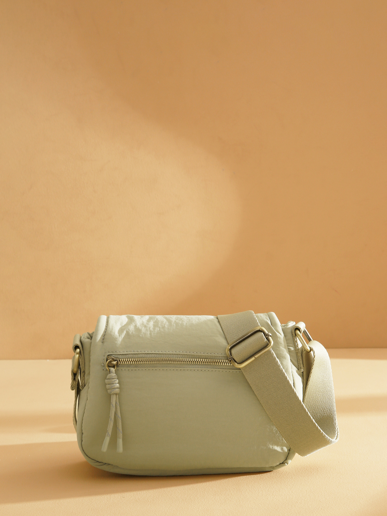 Le sac bandoulière PRIMEVERE, au petit format, séduit par son rabat aimanté, sa fermeture zippée sécurisée et ses poches. Il est zippé à l'avant et l'arrière. Confectionné en nylon recyclé, il dispose d’une bandoulière réglable pour un porté en bandoulière, d’un intérieur doublé en coton et lin comprenant deux poches simples, une poche zippée et un compartiment unique, le logo doré en résine et les cordons fantaisie apportent une touche raffinée.