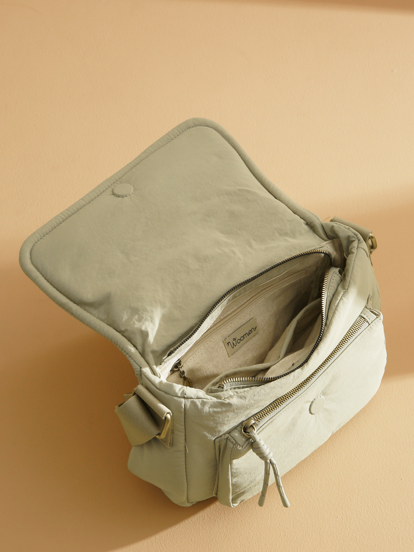 Le sac bandoulière PRIMEVERE, au grand format, se distingue par son rabat aimanté, sa fermeture zippée sécurisée et ses poches. Il est zippé à l'avant et l'arrière. Confectionné en nylon recyclé, il possède une bandoulière réglable pour un porté en bandoulière, un intérieur doublé en coton et lin équipé de deux poches simples, une poche zippée et un compartiment unique. Le logo doré en résine et les cordons fantaisies subliment ce modèle responsable.