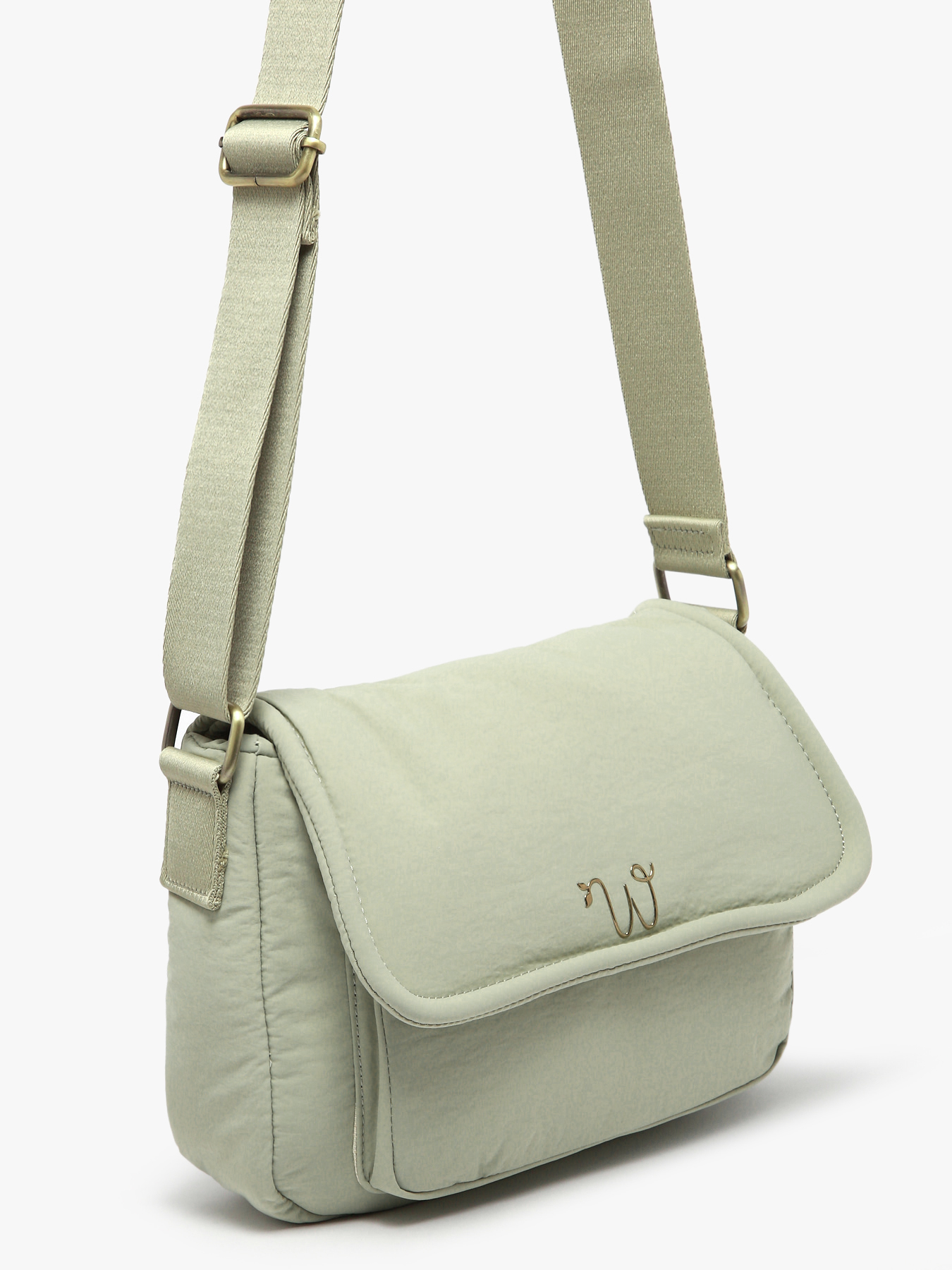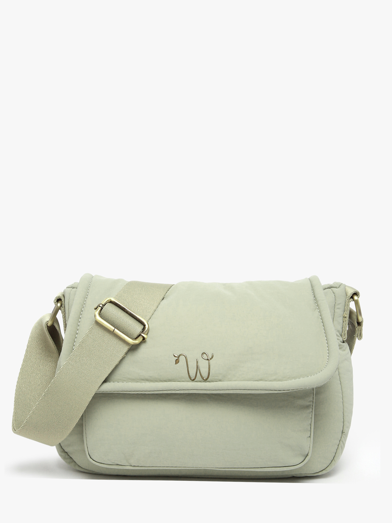 Le sac bandoulière PRIMEVERE, au grand format, se distingue par son rabat aimanté, sa fermeture zippée sécurisée et ses poches. Il est zippé à l'avant et l'arrière. Confectionné en nylon recyclé, il possède une bandoulière réglable pour un porté en bandoulière, un intérieur doublé en coton et lin équipé de deux poches simples, une poche zippée et un compartiment unique. Le logo doré en résine et les cordons fantaisies subliment ce modèle responsable.