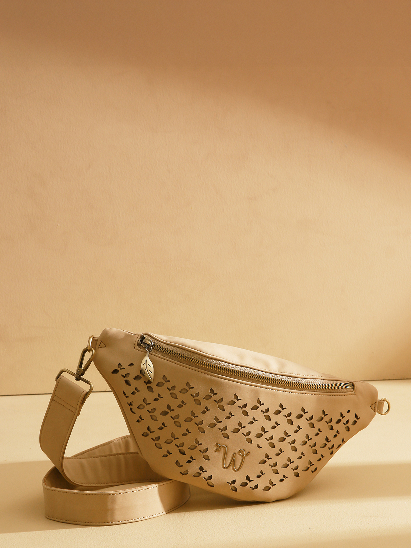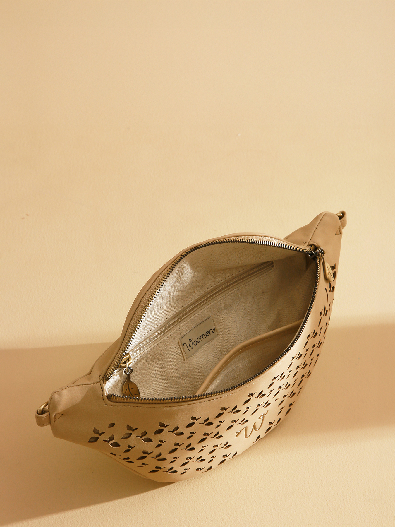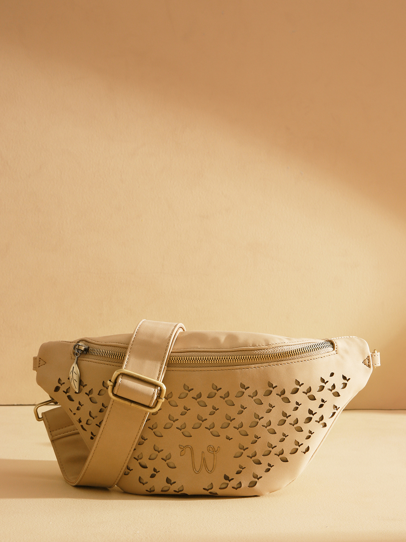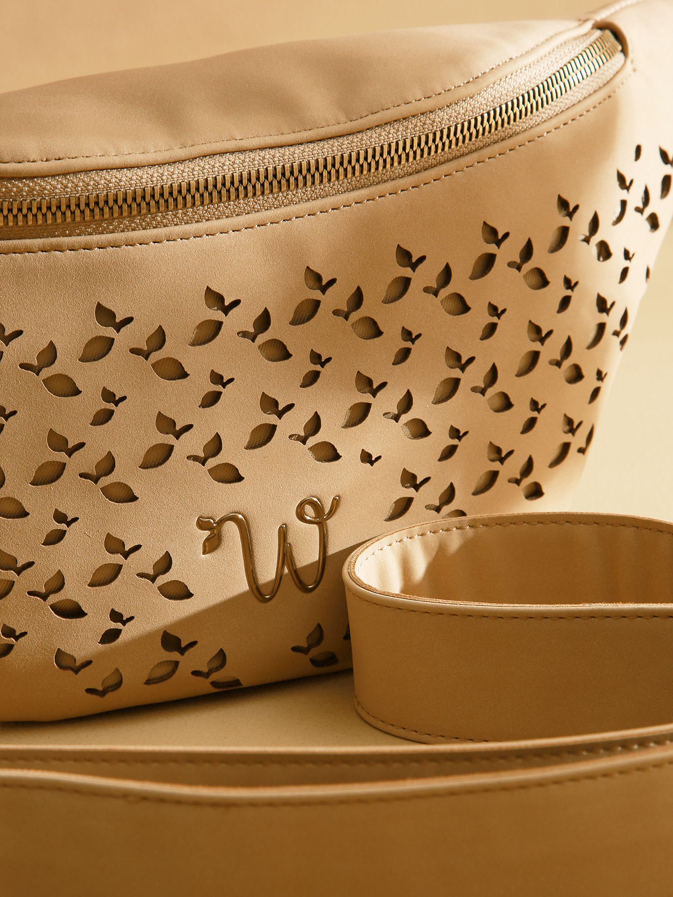 Le sac banane de la ligne Zamia se distingue par sa matière ajourée de petites feuilles, apportant élégance et originalité. Confectionné en polyuréthane composé à 58% de matières recyclées, avec une doublure en coton et lin, il allie durabilité et légèreté. Compact et pratique, il est orné du logo en résine dorée pour une touche raffinée. À l’intérieur, une poche zippée et une poche plaquée permettent de ranger et d’organiser vos essentiels en toute simplicité.