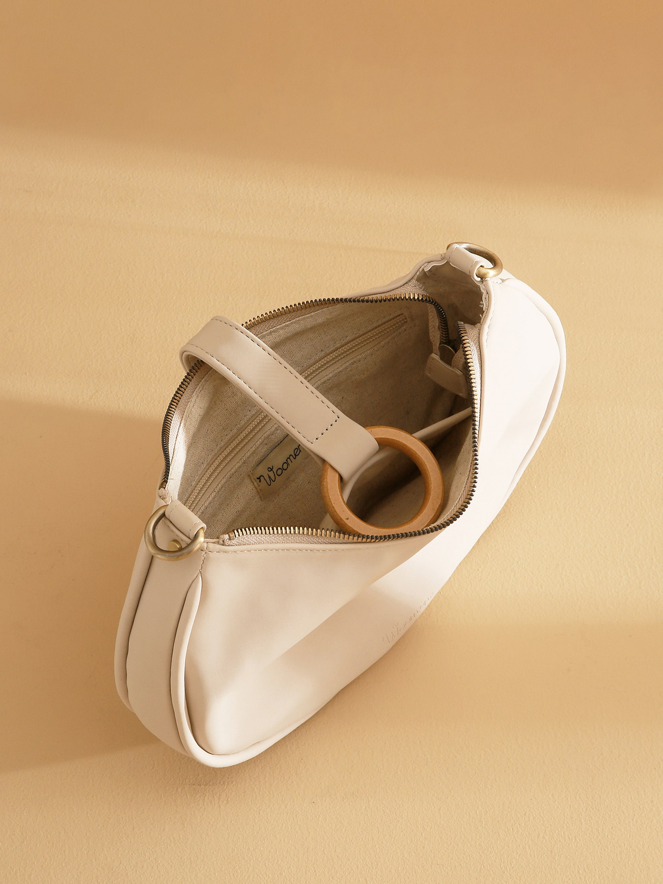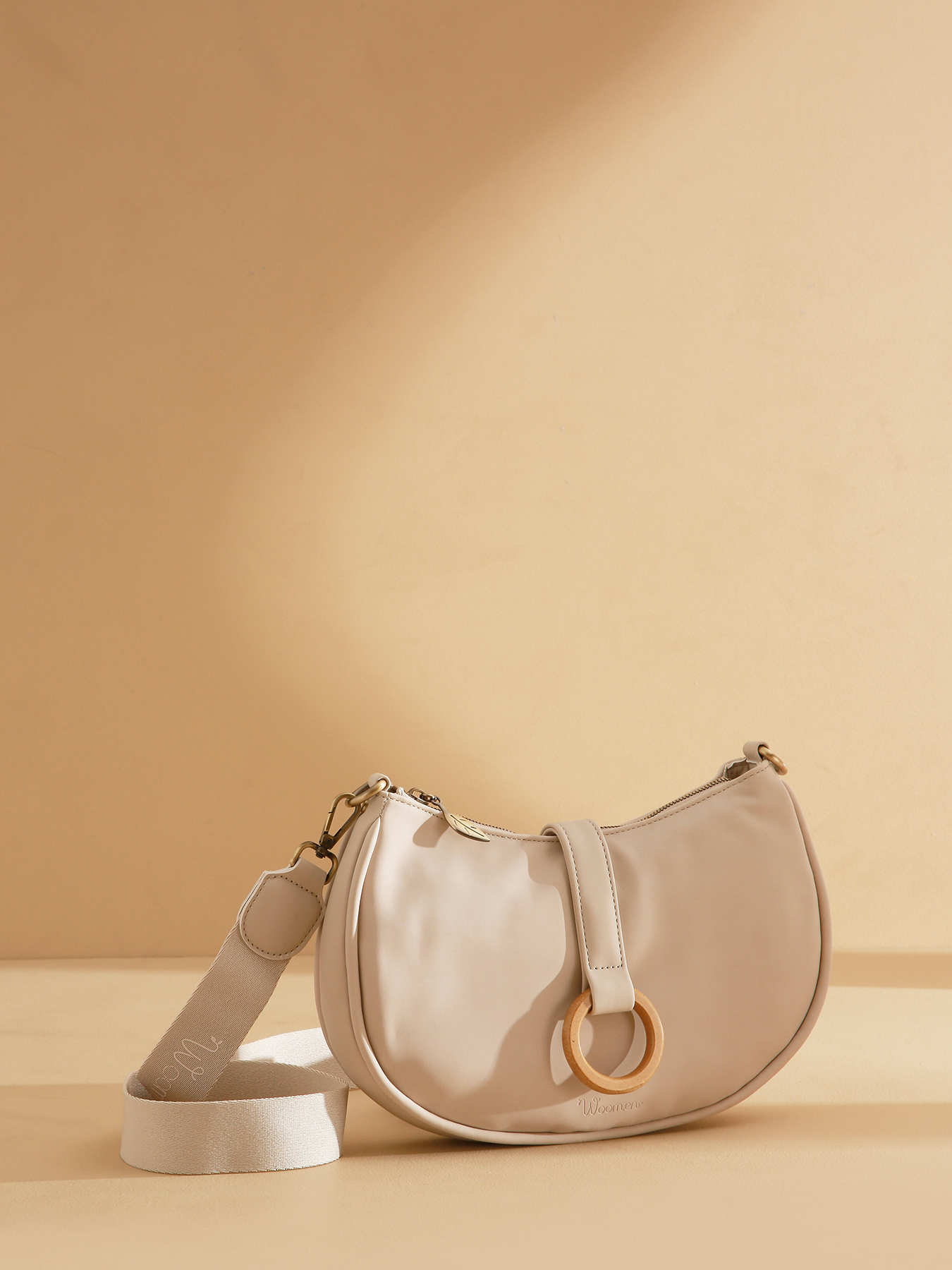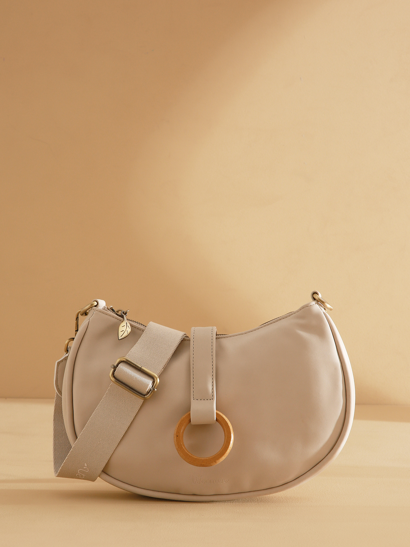 Deze CROCUS crossbodytas combineert elegantie en functionaliteit met een ritssluiting, een klep met magneet en een verstelbare en afneembare schouderriem bedrukt met het WOOMEN-logo. Gemaakt van gerecycled polyurethaan met een voering van katoen en linnen, beschikt hij over een hoofdvak, een steekvak, een ritssluitingvak en een buitenvak aan de achterkant. De decoratieve ring aan de voorkant geeft een moderne en onderscheidende touch.