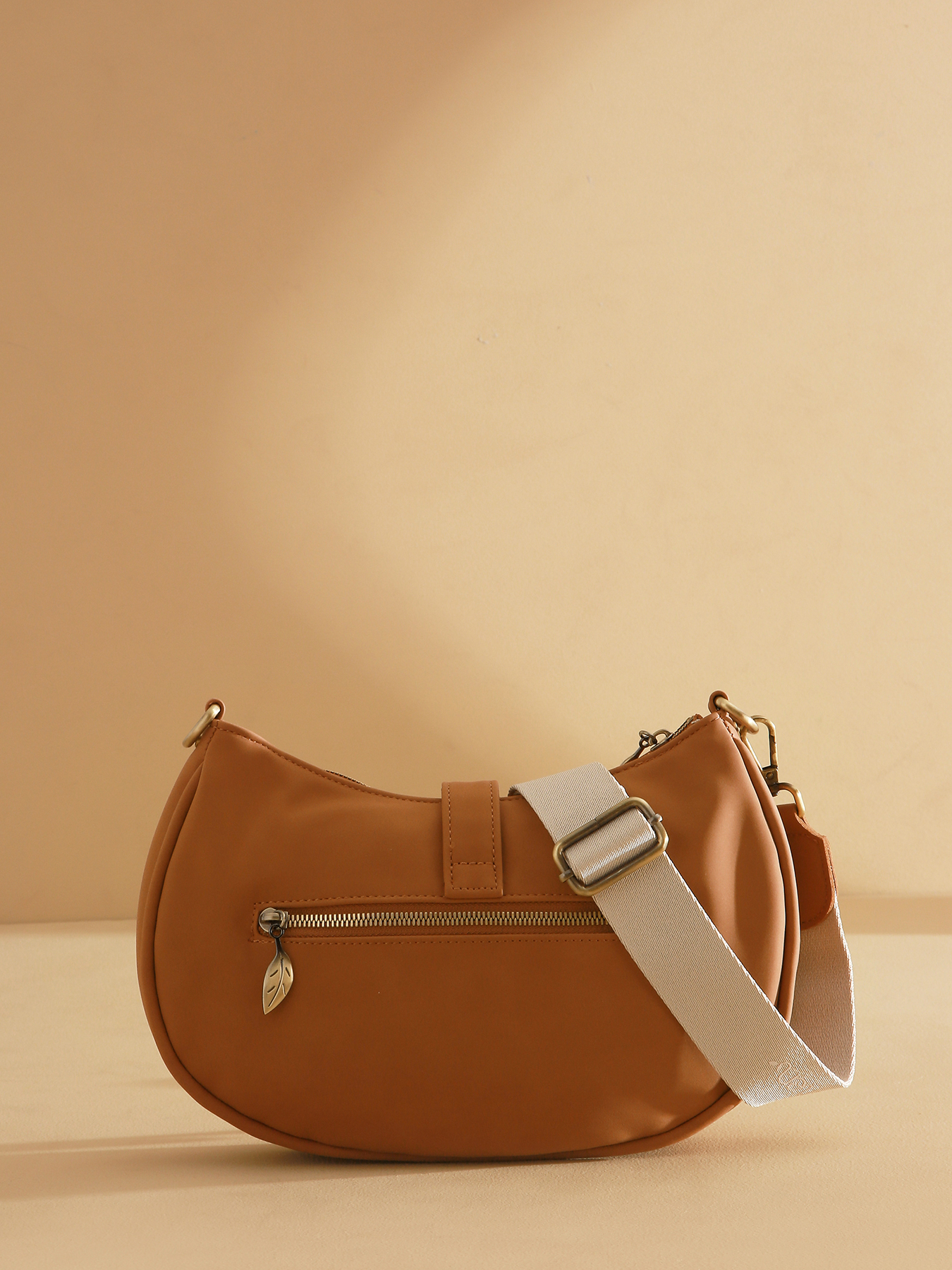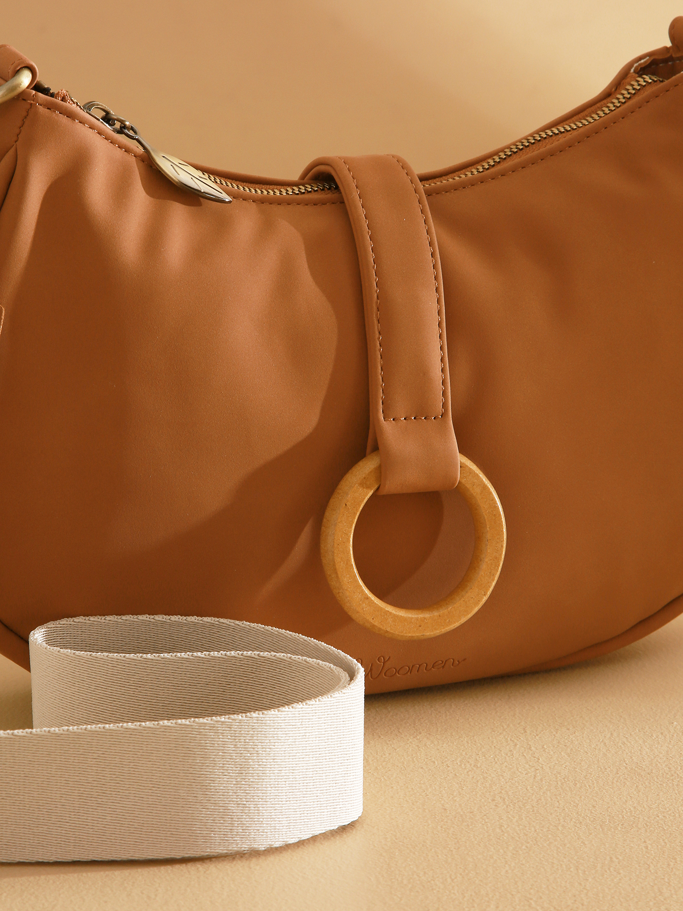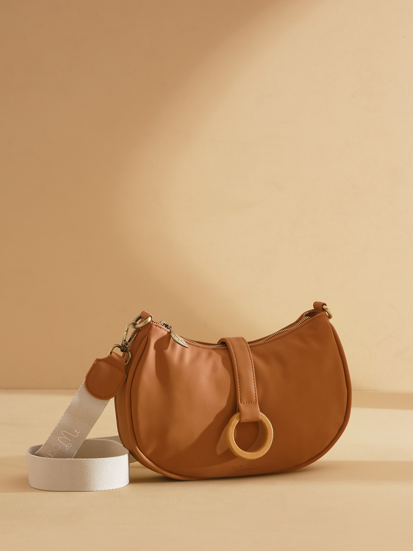 Deze CROCUS crossbodytas combineert elegantie en functionaliteit met een ritssluiting, een klep met magneet en een verstelbare en afneembare schouderriem bedrukt met het WOOMEN-logo. Gemaakt van gerecycled polyurethaan met een voering van katoen en linnen, beschikt hij over een hoofdvak, een steekvak, een ritssluitingvak en een buitenvak aan de achterkant. De decoratieve ring aan de voorkant geeft een moderne en onderscheidende touch.