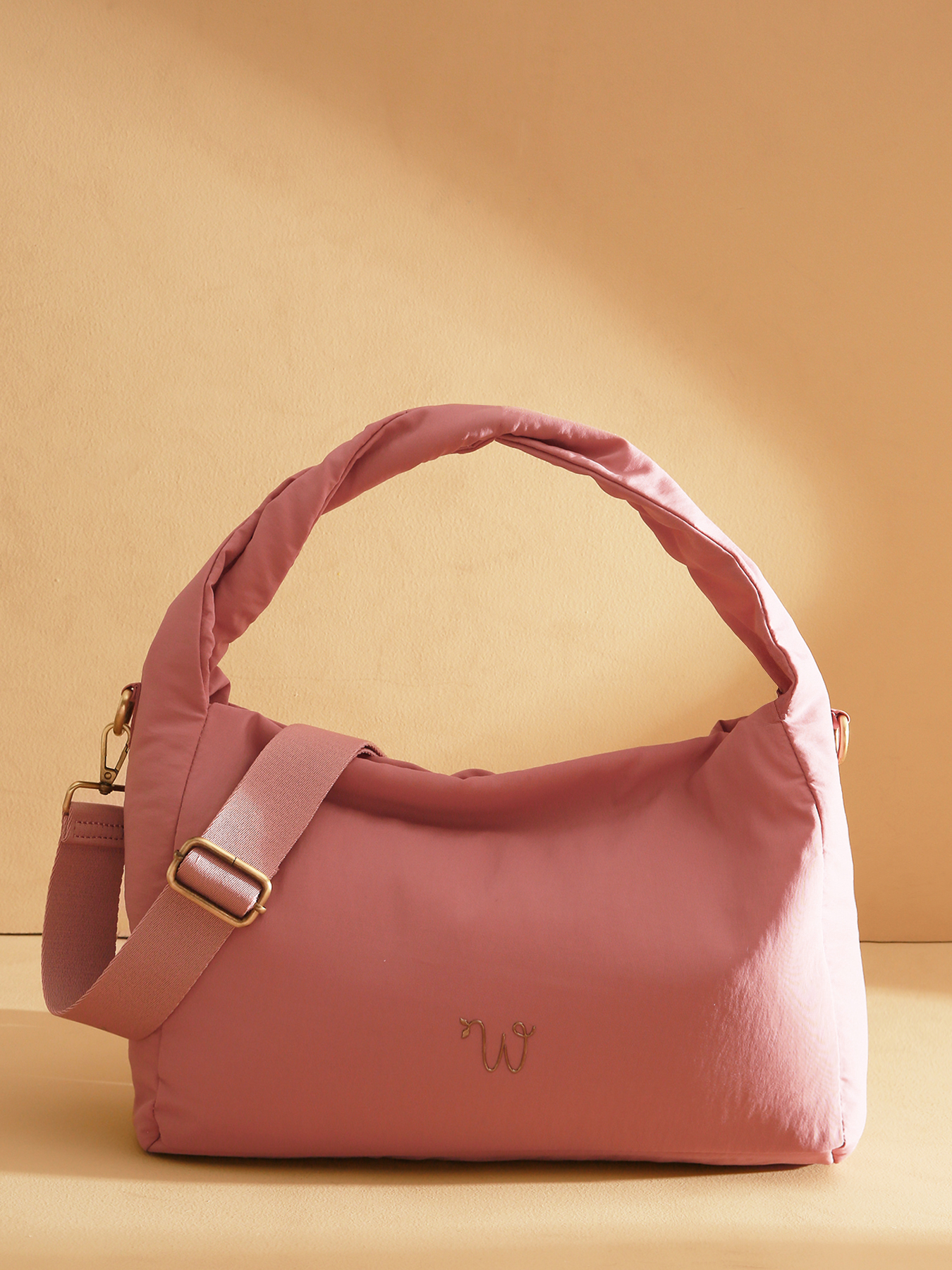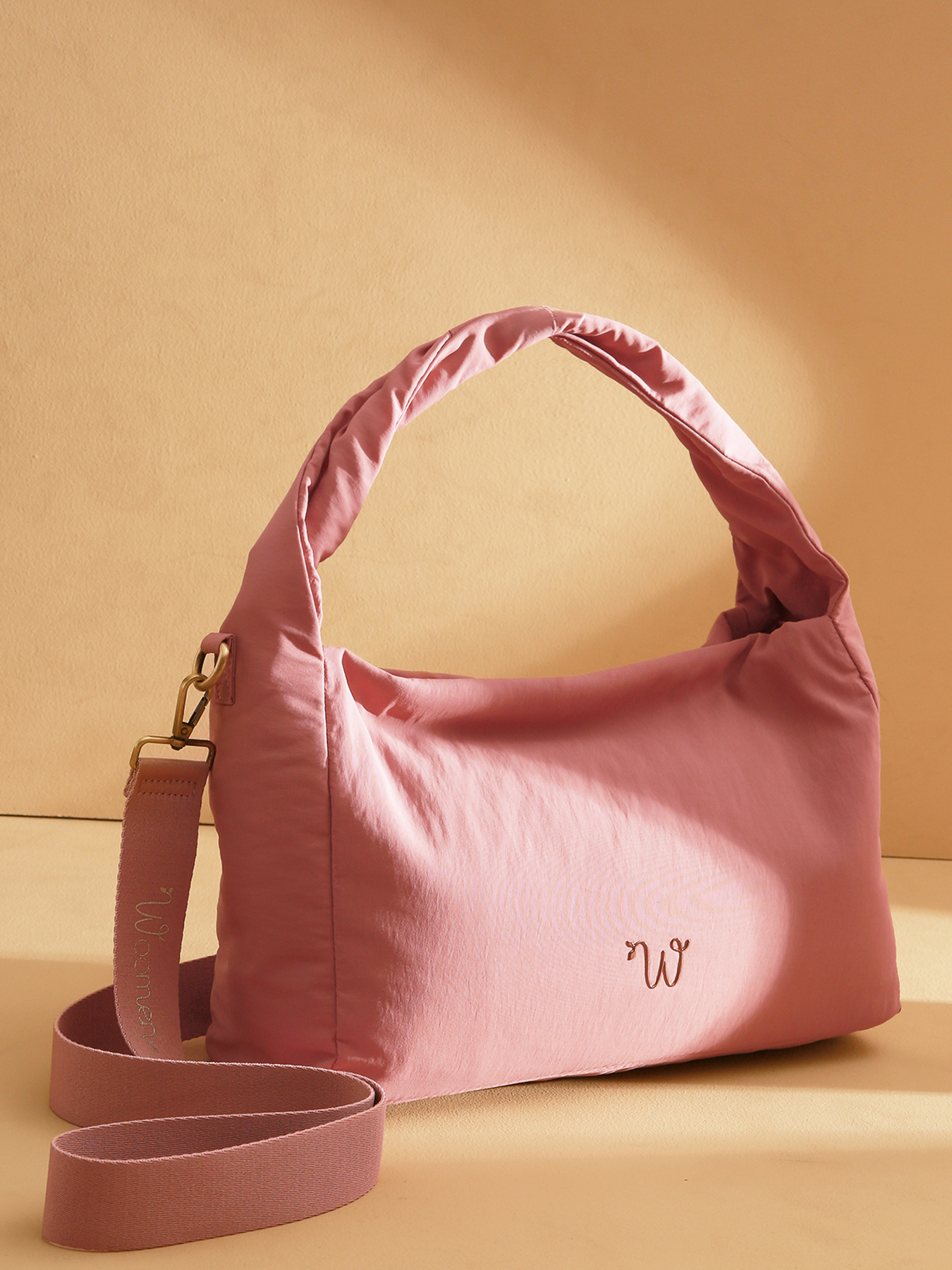 De PRIMEVERE schoudertas, in middelgroot formaat, valt op door zijn gedraaide hengsel, sierkoordjes en het gouden W-logo in hars. Gemaakt van gerecycled nylon, is hij voorzien van een ritssluiting, een verstelbare en afneembare schouderriem voor draagcomfort op de schouder of crossbody, een achtervak en een met katoen en linnen gevoerde binnenkant met twee insteekvakjes, een ritsvak en één hoofdvak.