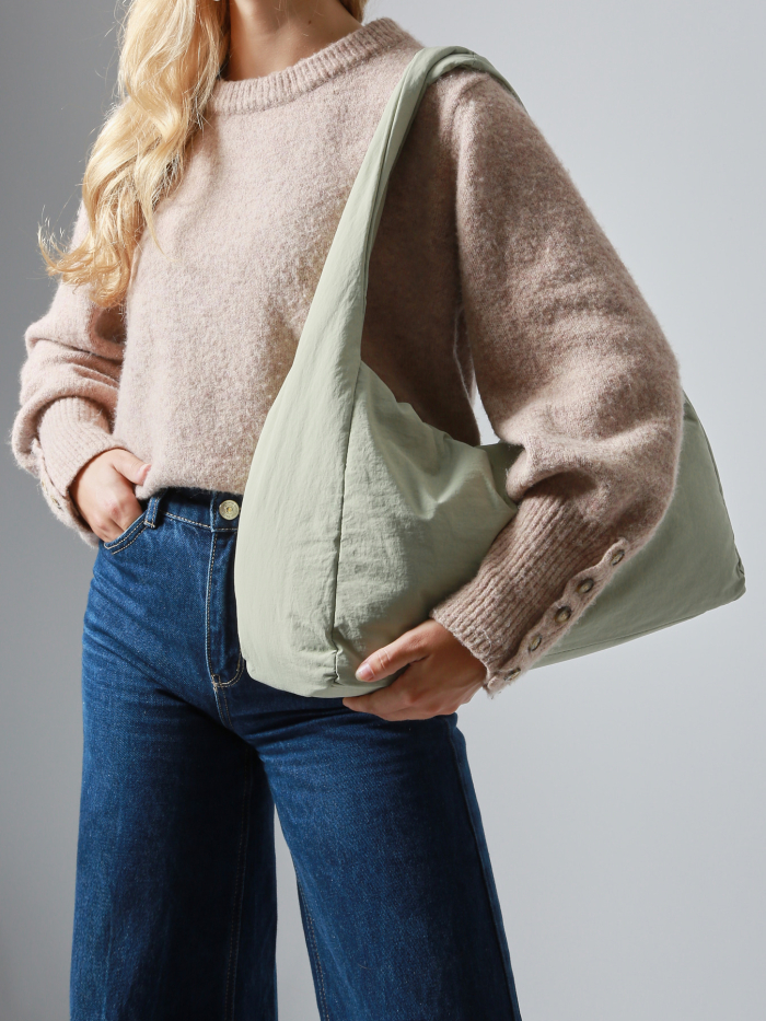 De PRIMEVERE schoudertas, praktisch van groot formaat, valt op door zijn elegante gedraaide hengsel, sierkoordjes en het gouden W-logo van hars. Gemaakt van gerecycled nylon, beschikt hij over een ritssluiting, een achtervak en een binnenkant gevoerd met katoen en linnen met twee eenvoudige vakken, een ritsvak en een hoofdvak.
