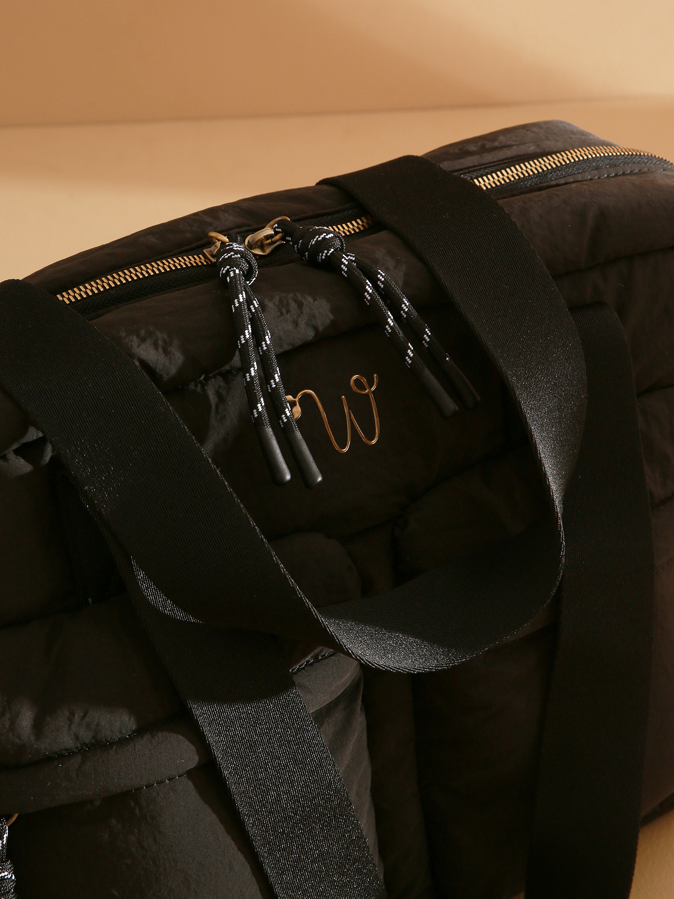 De PRIMEVERE weekendtas, gemaakt van gerecycled nylon met een voering van katoen en linnen, combineert praktisch gebruik en elegantie. Hij kan over de schouder gedragen worden, crossbody of in de hand dankzij de geïntegreerde schouderriem. De functionele buitenkant heeft twee vakken aan de voorkant en een achtervak met een verborgen handvat om hem aan een koffer te bevestigen. Het gouden logo en de sierkoordjes maken dit verantwoorde accessoire af, ontworpen voor stijlvolle en efficiënte reizen.