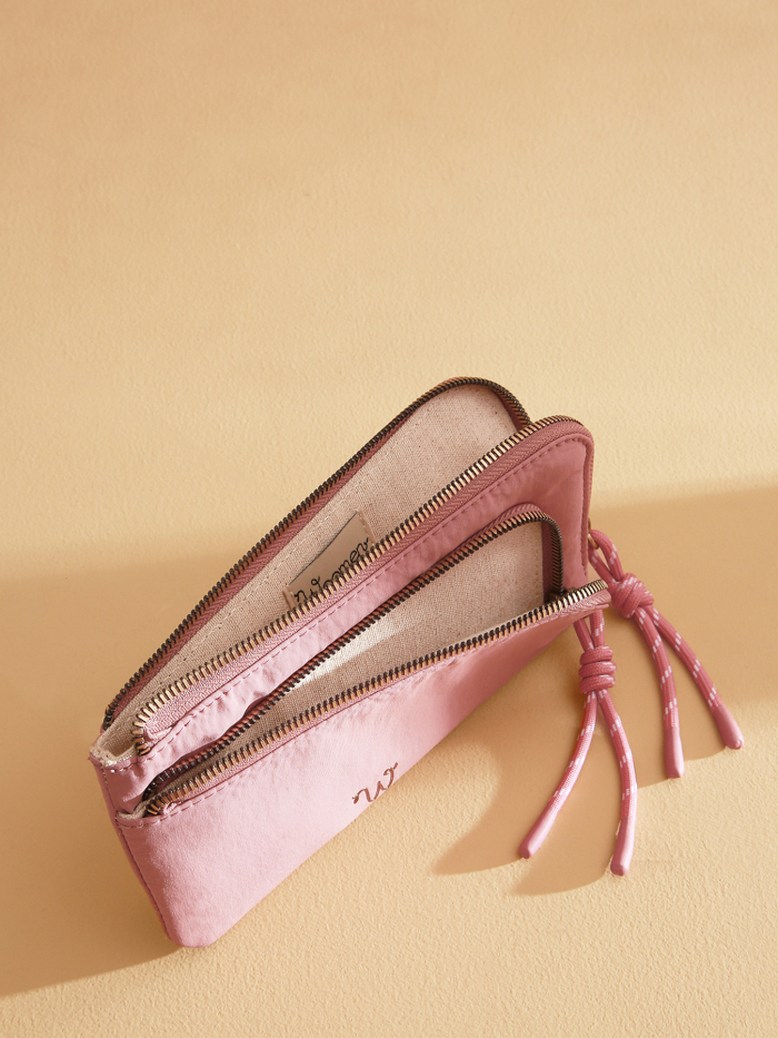 De portemonnee uit de lijn Primevère combineert stijl, praktisch gebruik en duurzame betrokkenheid. Het hoofdmateriaal van gerecycled nylon, gevoerd met katoen en linnen, biedt lichtheid en stevigheid. De decoratieve koorden en het onderscheidende logo geven het model originaliteit en raffinement. Hij beschikt over twee ritscompartimenten om je essentials te organiseren, en het gouden resinelogo maakt deze portemonnee een praktisch, elegant accessoire dat perfect is voor dagelijks gebruik.